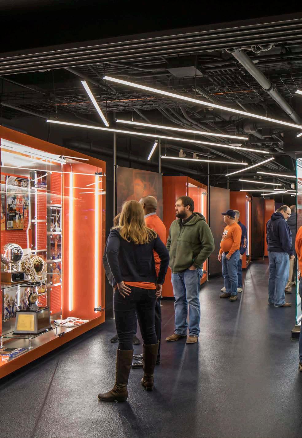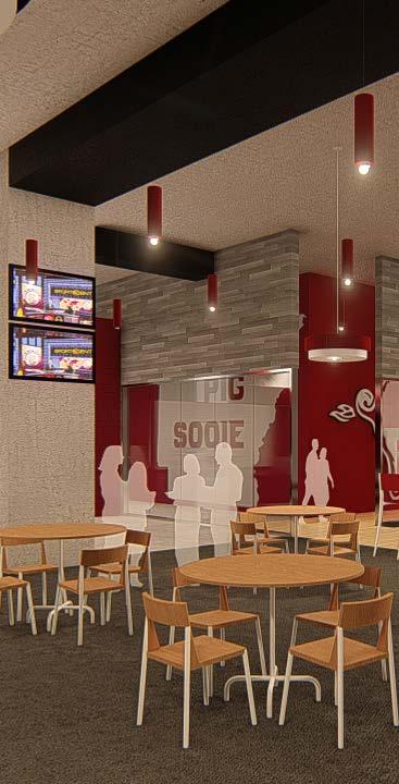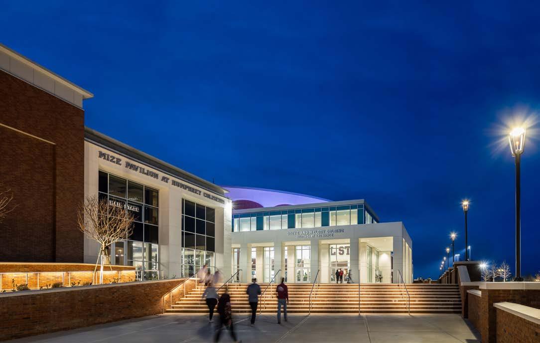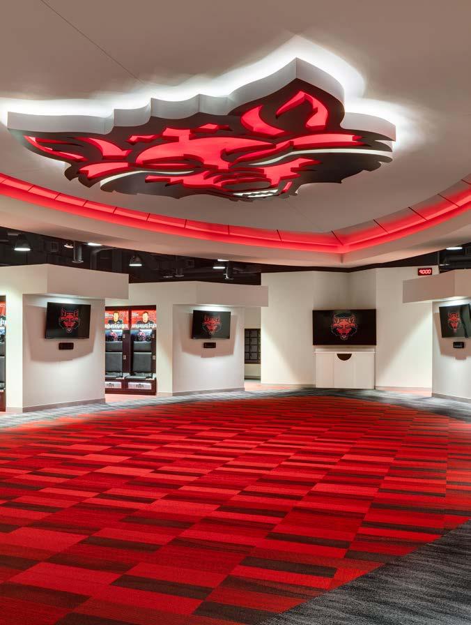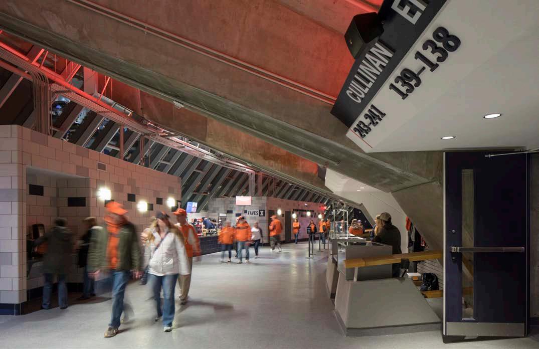 Phase I consists of 600 new club seats and new club amendments to the seating bowl in two corners to create super-voms and new AV enhancements, including ribbon boards. The building’s exterior was also reimagined, with a new building addition to the arena creating dramatic entry and arrival experiences for fans and a new dedicated student entry providing a fresh but contextual image for the 40-yearold structure. Concourse enhancements include renovated concessions and addition of new grab-n-goes and renovated restrooms.