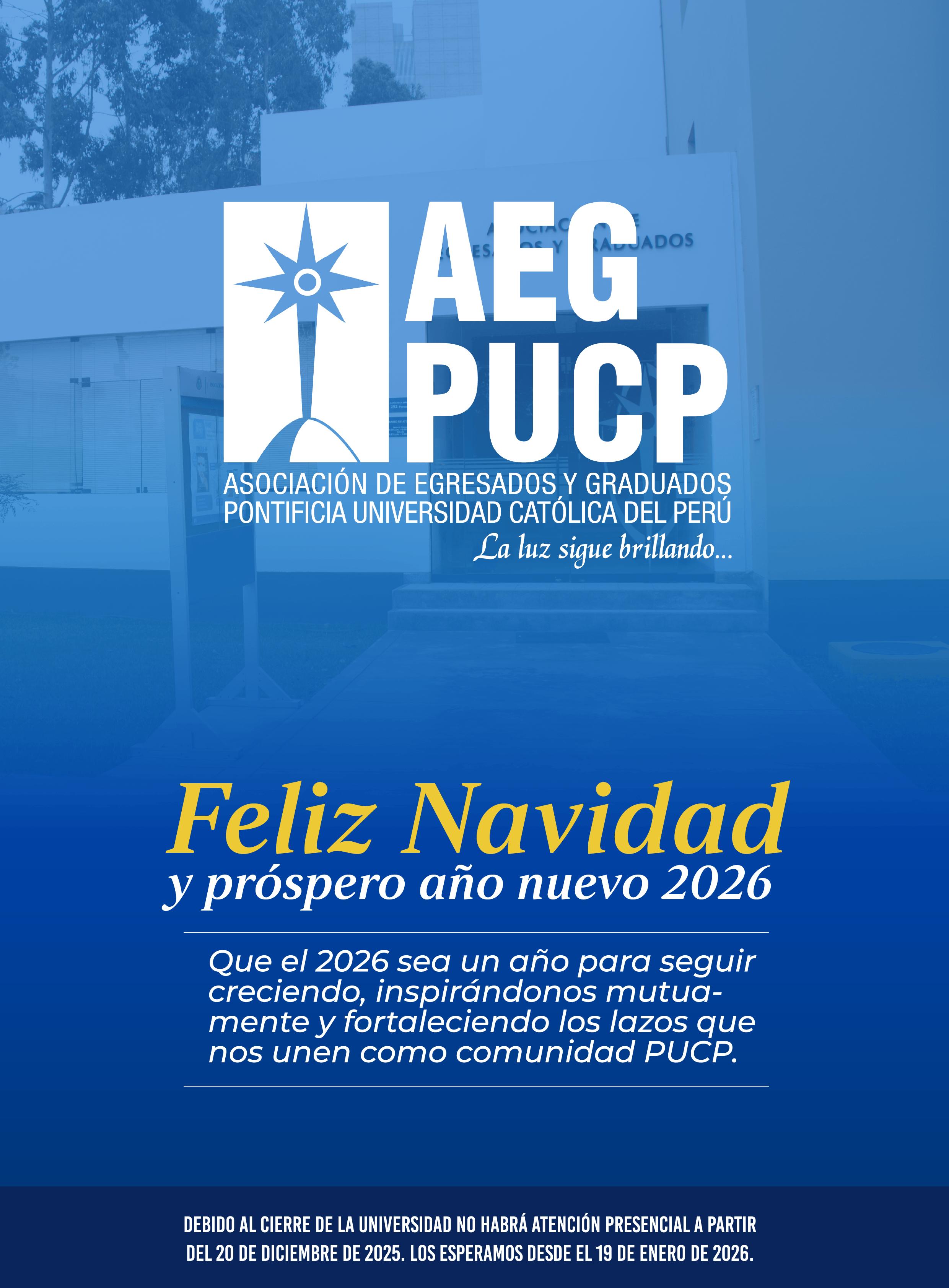 Les deseamos unas felices fiestas y un próspero Año Nuevo. Desde la Asociación de Egresados y Graduados, trabajamos con compromiso y vocación para impulsar iniciativas que fortalezcan nuestra comunidad, amplíen su proyección y generen un impacto positivo tanto en el Perú como en el mundo. En cada paso que damos, llevamos con nosotros el espíritu de nuestra universidad. Sigamos conectados, apoyándonos mutuamente y demostrando, una vez más, que juntos somos capaces de transformar el futuro. Los invitamos a estar atentos a lo que se viene en 2026, un año que traerá nuevas oportunidades para seguir construyendo, unidos, una comunidad sólida y activa.