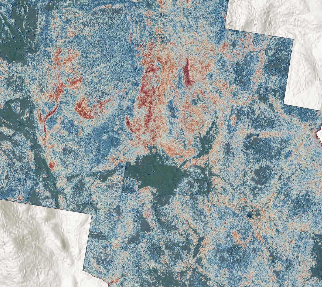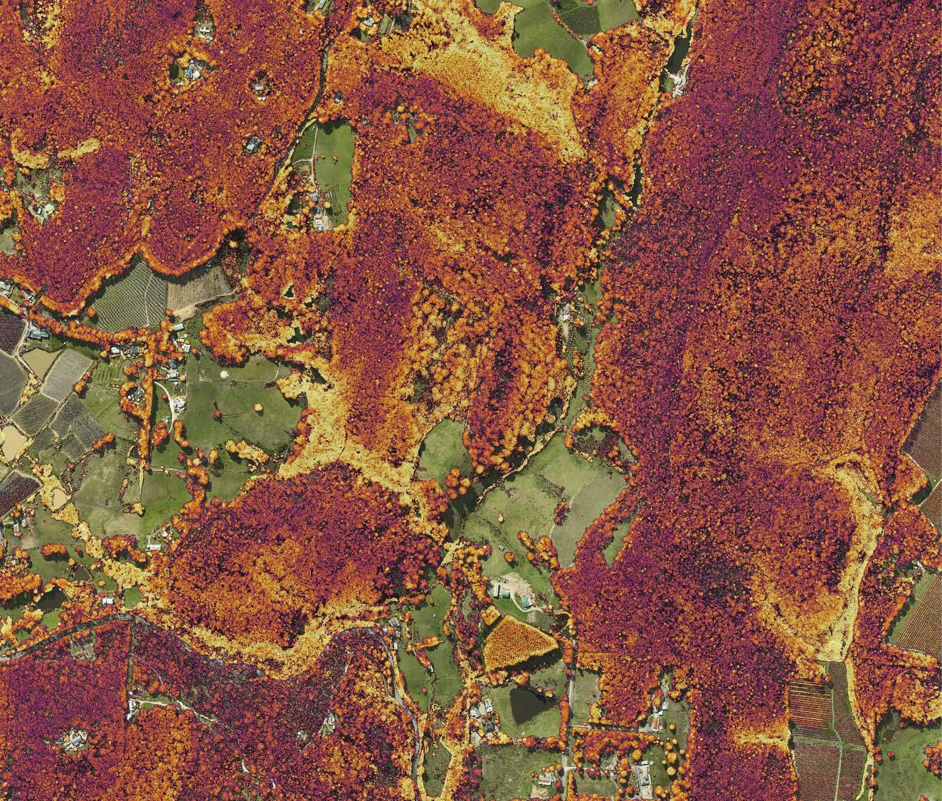These maps show how continuous vegetation is from ground level to the top of the canopy. This can be useful to understand the stage of growth for managed forests and precision agriculture. In the image here, blue represents low connectivity and red is high connectivity.