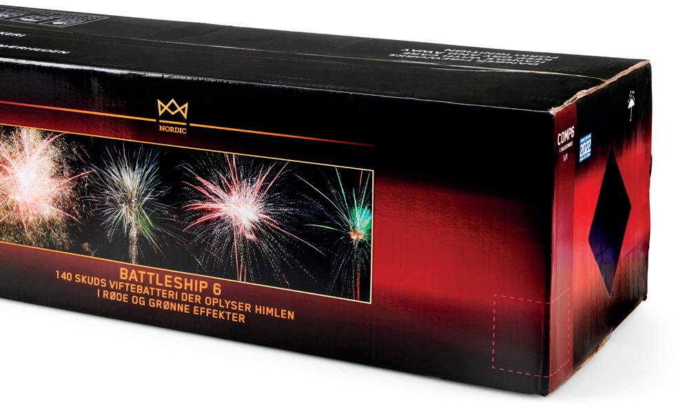 FYRVÆRKERIPOSTEN 2022 4 HUSK BRILLERNE for sikkerhedens skyld! KLASSISKE KOMBINATIONSBATTERIER FRA AFAC Top kvalitet fra Nordic Fireworks! NORDIC BATTLESHIP 3 200 skud danser på himlen i sølv og guld nuancer og springer ud som glimmer. Flotte haler og store vifter af røde stjerner og skarp blitz efterfølges af palmer i forskellige højder. En serie af guld og røde vinger afslutter compounden, der består af 3 sammensatte batterier af hver deres karakter. VARENR. COMP3 NEM 1380 GRAM | 200 SKUD | 20 MM 129995 BESTIL NR. 12 NORDIC BATTLESHIP 6 Endnu et monsterstort Nordic Compound bestående af 2 stk. 42-skuds max loaded batterier, der et mix imellem brokade kroner og chrysanthemum samt farvede stjerner og strobeeffekt. Derudover 2 stk. 28-skuds vinkelbatterier bestående af piletræs effekter med guldhaler og blinkende stjerner. VARENR. COMP6 NEM 1971 GRAM | 140 SKUD | 30 MM BESTIL NR. 13 1 LUNTE 3 BATTERIER 199995 SPAR MERE KØB STORT NYHED 2022