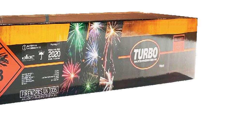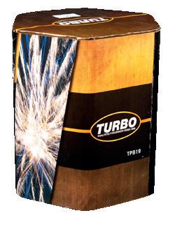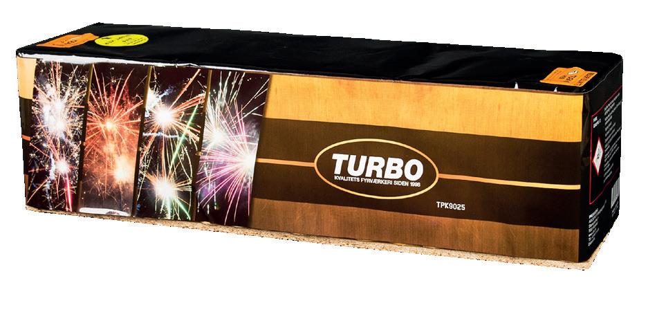 TURBO POWER FYRVÆRKERIPOSTEN 2022 6 FORMSTØBTE BATTERIER TURBO FORMSTØBT STRAIGHT-UP BATTERI 19-skuds 30 mm turbopower fyldt med glitter og silkeblå effekter. VARENR. TPB19 NEM 304 GRAM | 19 SKUD | 30 MM 29995 BESTIL NR. 14 TURBO FORMSTØBT STRAIGHT-UP BATTERI 36 røde og lemonfarvede peonyer, bomber med sølvfarvede haler og crackling som afslutning. VARENR. TPB36 NEM 425 GRAM | 36 SKUD | 25 MM 39995 BESTIL NR. 15 TURBO VIFTEBATTERI 25-skuds 20 mm vinkel-turbo peony power med blomster effekter. VARENR. TPB25 NEM 195 GRAM | 25 SKUD | 20 MM 24995 BESTIL NR. 16 1 LUNTE 3 BATTERIER NYHED 2022