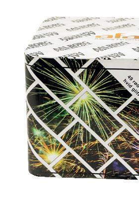 TURBO POWER FYRVÆRKERIPOSTEN 2022 7 FORMSTØBTE BATTERIER AALBORG POWERBLOCK STRAIGHT-UP BATTERI Formstøbt batteri med 49 store 25 mm bomber med grønne og blå peoner mellem et fantastisk hav af hvide blinkere og røde stjerner. VARENR. AP34 NEM 490 GRAM | 49 SKUD | 25 MM 49995 BESTIL NR. 18 TURBO STRAIGHT-UP KOMBINATIONSBATTERI Stilrent batteri med både miner og guld palmer og peony med blink i flotte farve kombinationer og i meget velovervejet tempo. VARENR. TPK9025 NEM 1028 GRAM | 90 SKUD | 25 MM TURBO VIFTE KOMBINATIONSBATTERI Voldsomt 600-skuds fyrværkeri inferno, der varer hele 3 minutter og 30 sekunder, med et væld af guldstjerner og chrysanthemum effekt samt vekslende farvekombinationer. VARENR. TPB600 NEM 1757 GRAM | 600 SKUD | 14 MM 129995 199995 BESTIL NR. 17 BESTIL NR. 19 1 LUNTE 4 BATTERIER NYHED 2022