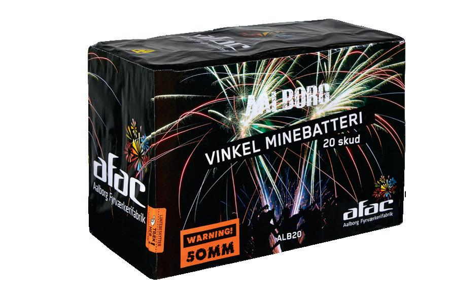 TURBO POWER FYRVÆRKERIPOSTEN 2022 8 AALBORG KRUDT NYHED 2022 LAVET AF PAPIR Årets vildeste nyhed! Ægte 50 mm minebatteri med vinkelskud! 59995 SPAR 29985 SÆTPRIS NYHED 2022 AALBORG VINKEL MINEBATTERI Vinkel minebatteri med 20 kæmpe skud med rød mine og orange dahlia, der brydes med grønne stjerner og eksploderende blomster i sølv. VARENR. ALB20 NEM 770 GRAM | 20 SKUD | 50 MM 99995 BESTIL NR. 20 300-SKUDS STALINORGEL Det klassiske stalinorgel, der er kendt for at blive ved og ved og ved og ved… Crackling hyle missiler med knald og så hele 300 af dem! VARENR. AMP300 NEM 216 GRAM | 300 SKUD | 8,5 MM 19995 BESTIL NR. 21 FORMSTØBT BATTERISORTIMENT Batterisortiment med 4 formstøbt batterier, der sikrer en spændende aften. Hvert batteri har deres eget kendetegn, med tilsammen giver 99 store skud i rødlige nuancer, der brydes med grønne stjerner og eksploderende cracking i guld. Ikke mindst vil du se lange strobelys, swirling haler og skarpe lyn i dette sortiment!