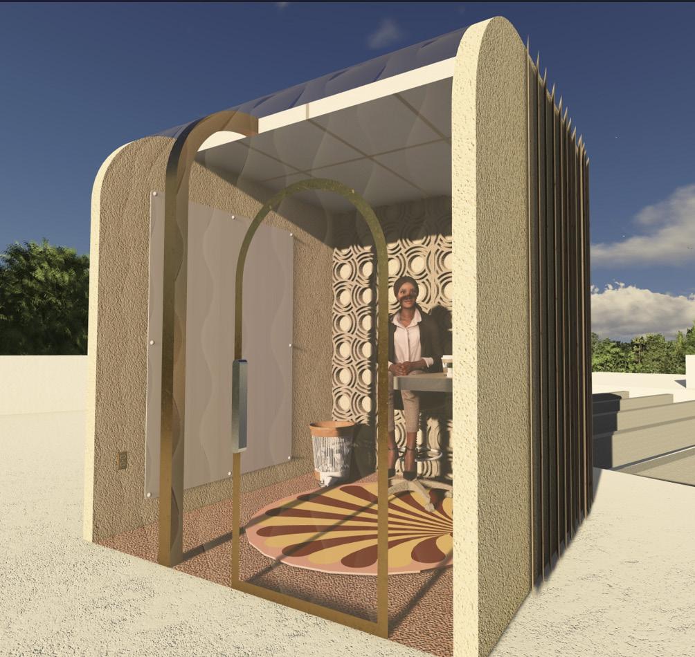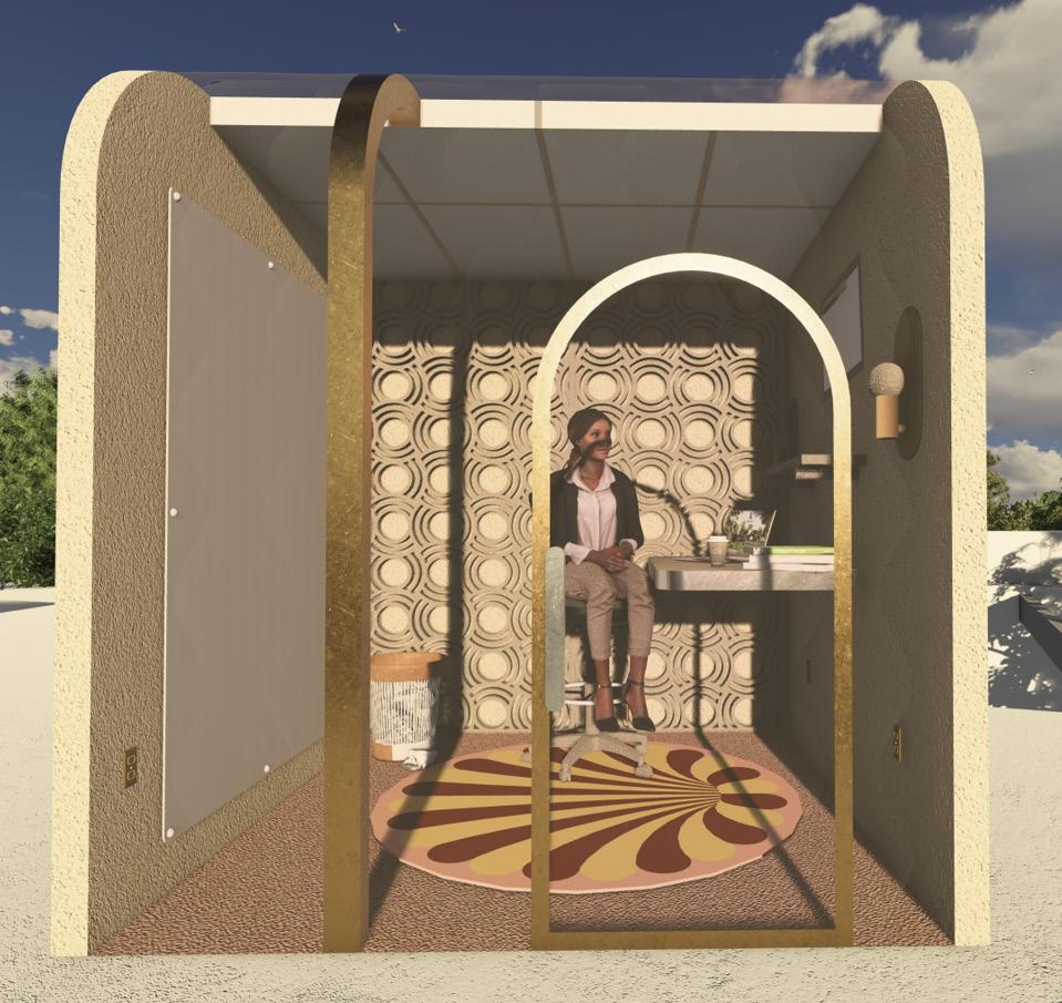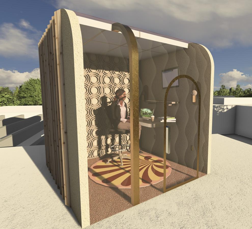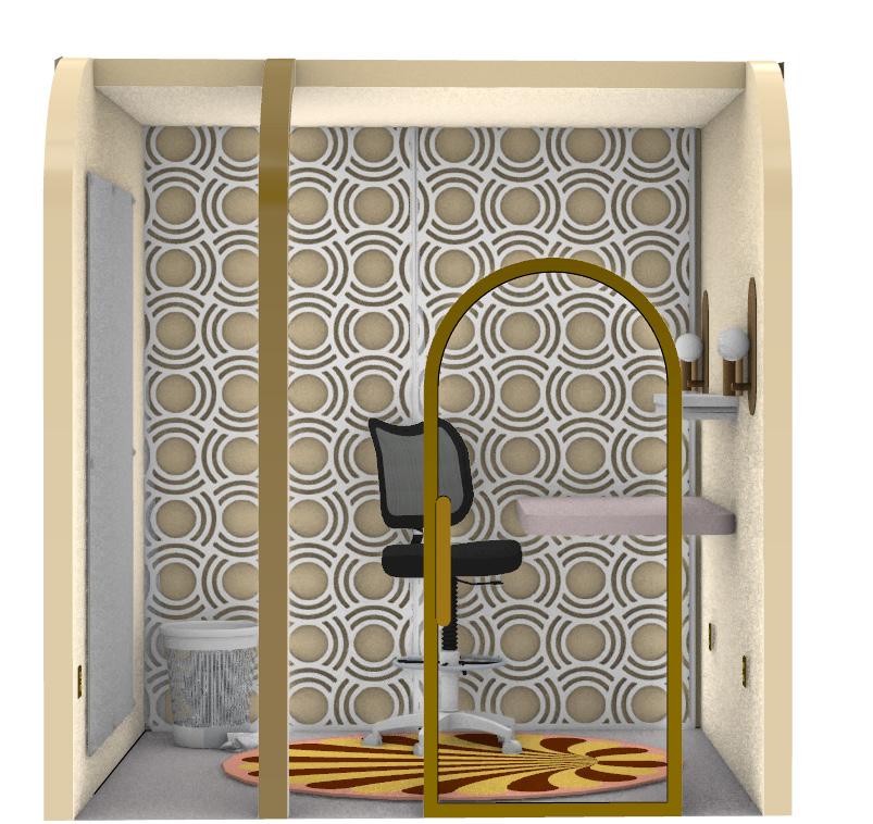 The design of this workpod is designed for the individual who thrives in chaos and creative workflow, yet needs time to get work done in solidarity. To reflect this, the workpod takes the appearance of a timless and calming aesthetic with the use of vibrant colors and vintage texture.
