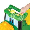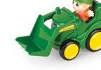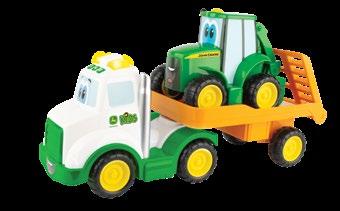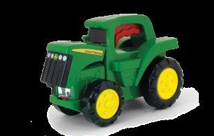 Constructed with die-cast body, hood, and wide front axle. Cab features include clear windows and opening cab door that reveals detailed interior. Features soft feel tyres on die-cast wheels and rear three point hitch that raises and lowers. The tractor is equipped with the quad range transmission. Age grade 14+.