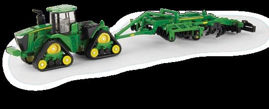 The second John Deere item in the Precision Heritage series. The tractor features die-cast construction. It is configured with a narrow front axle and equipped with an authentic style hitch. The disk is constructed with a die-cast frame and disk blades. The implement hitches to the tractor and features linking hydraulic details. Age grade 14+.