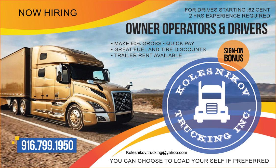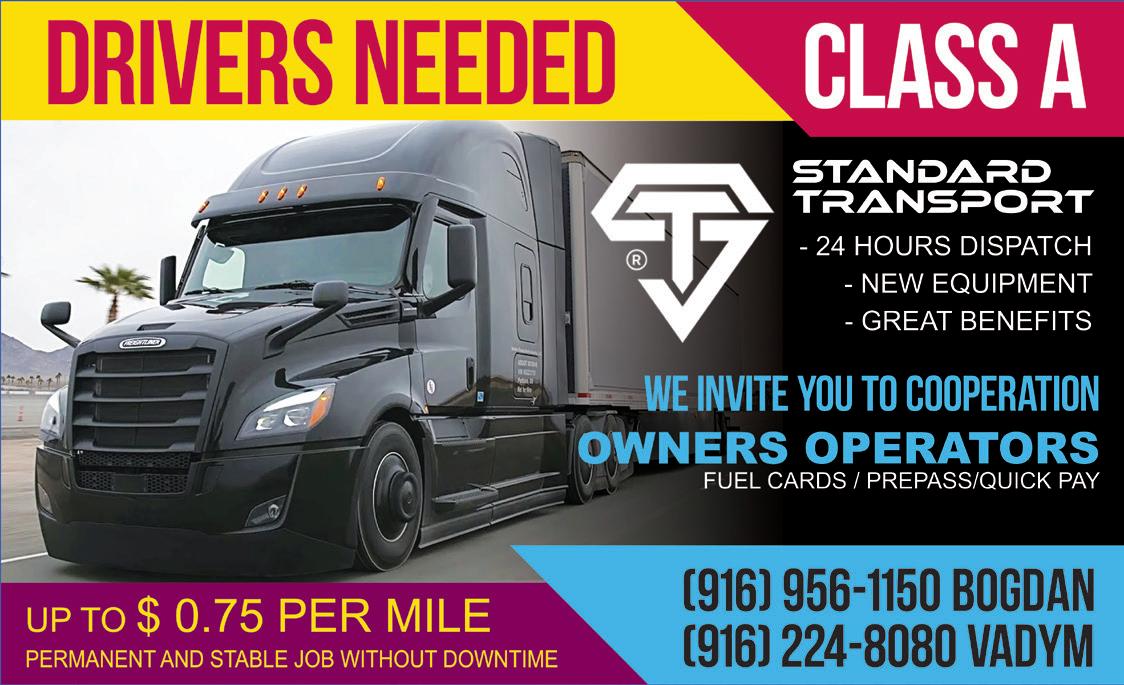 [24] Class A drivers: flexible schedule, short and long trips, dry van and flatbed loads. Good salary. Тел.: (916) 993-0919.