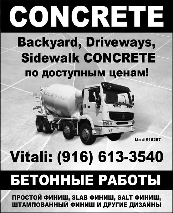 [23] Требуются рабочие по уборке офисов в Rancho Cordova, Roseville, Rocklin, Granite Bay, Sacramento. Желательно мужчина и женщина с одной семьи. Должны иметь офици альное удостоверение на право работы в Штатах. Тел.: (916) 410-3316.