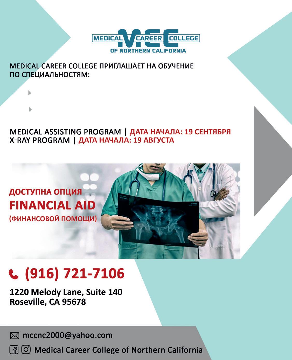 [19] Приглашаем всех на обучение по специальностям Medical Assisting with Limited Permit X-ray Technician и Limited Permit X-ray Technician, которое предлагает Medical Career College. Даты начала новых курсов: понедельник, 3 октября, и среда, 26 октября. Вы можете начать новую карье ру всего за 12 месяцев