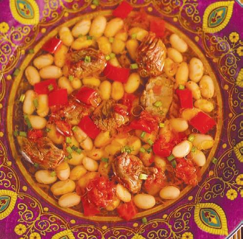 700 г баранины на косточке, 1 луковица, 1 морковь, 150 г белой фасоли, 1 красный болгарский перец, 2 ст. л. томатной пасты, 1 лавровый лист, 1 гвоздика,2 горошины душистого перца,соль,черный молотый перец,2 литра воды,зелень. Фасоль промыть и замочить на ночь. Отварить в соленой воде в течение 1 часа.Мясо срезать с костей, обрезать лишний жир и нарезать маленькими кусочками. Из воды, костей, ½ луковицы, ½ моркови и специй сварить бульон (примерно 1 час). Мясо обжарить на растительном масле, посолить и поперчить. Перец нарезать квадратами, лук мелко нарезать, морковь и чеснок натереть на мелкой терке. Добавить овощи к мясу и потушить. Добавить томатную пасту и еще немного потушить. Вытащить кости с овощами из бульона (они нам больше не нужны), положить в него мясо с тушеными овощами, фасоль и поварить еще минут 10. Перед подачей посыпать нарезанной зеленью.