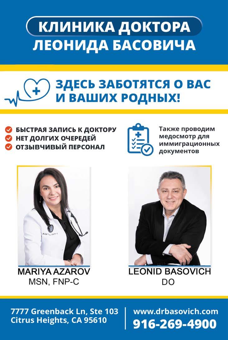 # 9 (2024) • 12 мая Газета «Диаспора» – все о нас с вами ПО ВОПРОСАМ РАЗМЕЩЕНИЯ РЕКЛАМЫ ОБРАЩАЙТЕСЬ ПО ТЕЛЕФОНУ: (916) 487-9701 или (916) 705-0739 10 Замещение всех зубов на 4-х, 6-ти имплантах Одиночные импланты Несколько имплантов ИМПЛАНТАЦИЯ ЗУБОВ Установка одного импланта от FREE Consultation and CT-Scan Лучшее качество услуг и материалов по разумной цене! Консультация и 3D снимок в подарок. 911 Reserve Dr., Ste #150, Roseville, CA 95678 | Phone: (916) 827-3605 $998* (916) 827-3605 Высококлассные услуги по Зубной Имплантации в современной клинике, лимиторованной на установку имплантов. * - установка 1 (одного) импланта не включая абатмент и коронку. Имплантация будет производится одним из специалистов клиники под руководством доктора Александра Антипова, челюстно-лицевого хирурга. Цена указана для пациентов, оплачивающих наличными. Все-на-5-ти имплантах + несъемные зубы за 1 день Одна из недавних операций: