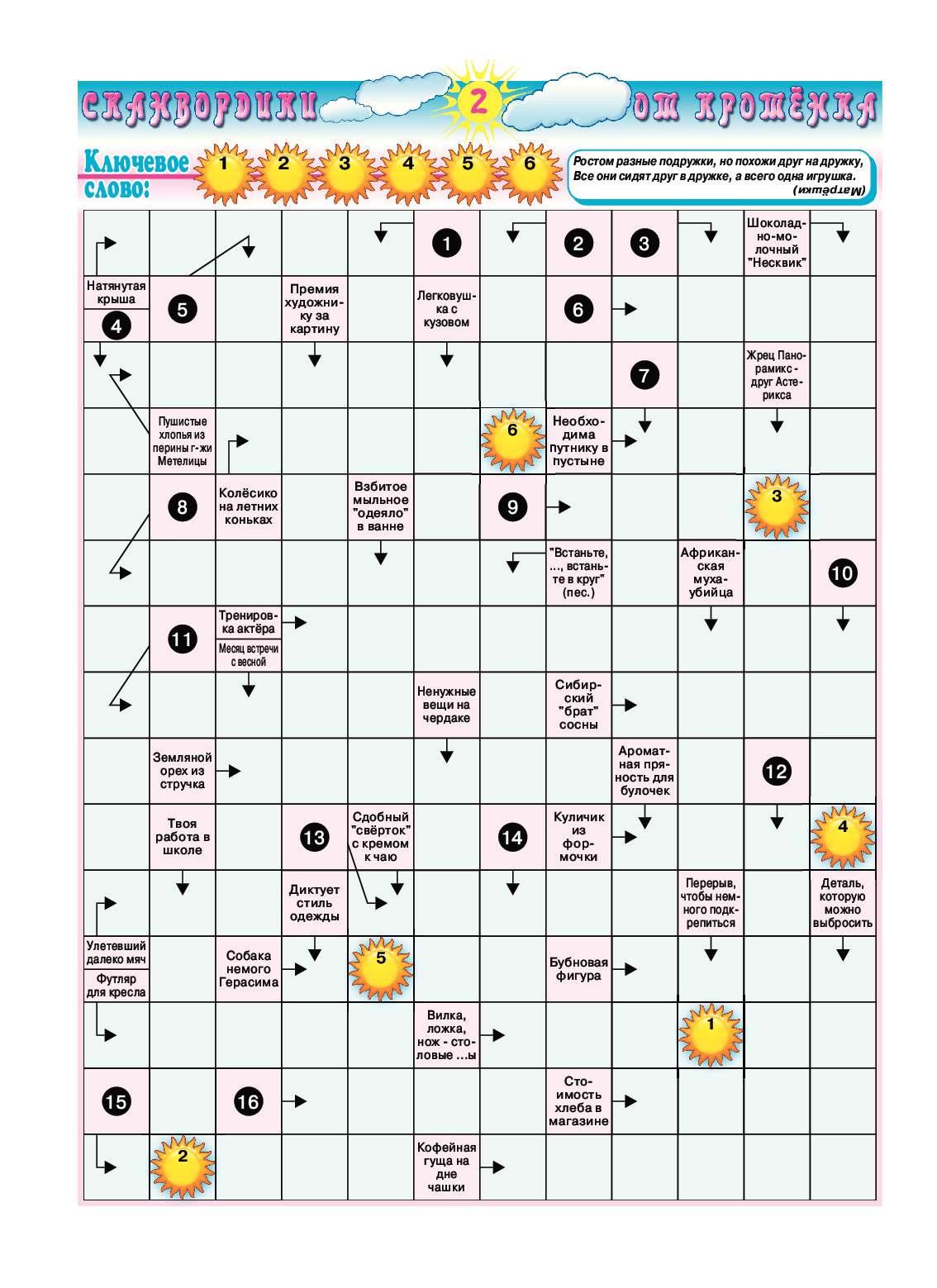решение присяжных заседателей. 29. «Пророчество» экономистааналитика. 31. Скрипач, завораживающий своим мастерством. 33. Магазин, куда бегут с рецептами от врачей. 34. Синяя примета сказочного женоубийцы. 37. Речь болтуна с бокалом в руке. 38. Степанчиково в повести Ф.М. Достоевского. ПО ГОРИЗОНТАЛИ: 1. Джакузи. 10. Похвала. Ошейник. Чача. Халупа. Симптом. Кардамон. 24. Букинист. Одеяло. Спидометр. Гном. 38. Коновал. 41. Арсенал. ПО ВЕРТИКАЛИ: 1. Доспехи. 2. Крот. 5. 7. Каравай. Лайнсмен. Достаток. Публика. 12. Кабачок. 17. Пьедестал. 19. Песочница. 20. Самовар. 21. Маникюр. 25. Ремешок. 26. Цитадель. 27. Бешамель. 28. Самосуд. 29. Долгота. 31. Парафин. 33. Основа. 34. Пропан. 37. Море. 38. Грек. ❖❖❖ ПО ГОРИЗОНТАЛИ: 1. Красота. 4. Ударник. 10. Централ. 11. Выслуга. 13. Слет. 14. Урна. 15. Военкомат. 16. Мотыга. 18. Огниво. 20. Стратег. 22. Этажерка. 23. Парабола. 24. Томагавк. 27. Расправа. 30. Монокль. 32. Рутина. 34. Бредни. 35. Покрывало. 36. Гнет. 38. Скат. 39. Ловелас. 40. Недолет. 41. Завтрак. 42. Майонез. ПО ВЕРТИКАЛИ: 1. Консоме. 2. Счет. 3. Тетива. 5. Долото. 6. Рагу. 7. Кашалот. 8. Планерка. 9. Автостоп. 10. Цейтнот. 12. Артикул. 17. Гражданин. 19. Гамбургер. 20. Сарказм. 21. Горесть. 25. Обстрел. 26. Конгресс. 27. Раковина. 28. Вердикт. 29. Прогноз. 31. Виртуоз. 33. Аптека. 34. Борода. 37. Тост. 38. Село. ПО ГОРИЗОНТАЛИ: 1. Красота. 4. Ударник. 10. Централ. 11. Выслуга. 13. Слет. 14. Урна. 15. Военкомат. 16. Мотыга. 18. Огниво. 20. Стратег. 22. Этажерка. 23. Парабола. 24. Томагавк. 27. Расправа. 30. Монокль. 32. Рутина. 34. Бредни. 35. Покрывало. 36. Гнет. 38. Скат. 39. Ловелас. 40. Недолет. 41. Завтрак. 42. Майонез. ПО ВЕРТИКАЛИ: 1. Консоме. 2. Счет. 3. Тетива. 5. Долото. 6. Рагу. 7. Кашалот. 8. Планерка. 9. Автостоп. 10. Цейтнот. 12. Артикул. 17. Гражданин. 19. Гамбургер. 20. Сарказм. 21. Горесть. 25. Обстрел. 26. Конгресс. 27. Раковина. 28. Вердикт. 29. Прогноз. 31. Виртуоз. 33. Аптека. 34. Борода. 37. Тост. 38. Село. ОТВЕТЫ НА КРОССВОРД НА СТР. 11 ОТВЕТЫ НА СУДОКУ ПО ГОРИЗОНТАЛИ: 1. Грешник. 4. Ширина. 7. Балкон. 10. Бойница. 13. Привратник. 14. Дезодорант. 15. Жестокость. 16. Линза. 17. Лонгет. 18. Остров. 19. Егерь. 20. Тролль. 22. Апогей. 24. Пачка. 26. Революционер. 28. Кража. 30. Нарезка. 32. Ермолка. 36. Арлекин. 37. Сметана. 38. Игрек. 39. Русло. 40. Москвич. 41. Восторг. 42. Хинкали. 43. Сборник. 45. Танго. 47. Товарооборот. 52. Акция. 54. Кресло. 57. Метеор. 59. Свояк. 60. Флейта. 61. Свалка. 62. Бухта. 63. Экипировка. 64. Индивидуум. 65. Исполнение. 66. Тефтели. 67. Диктат. 68. Аренда. 69. Трудяга. ПО ВЕРТИКАЛИ: 1. Горница. 2. Шарлатан. 3. Консул. 4. Шекель. 5. Рыдание. 6. Апостол. 7. Боржоми. 8. Кутюрье. 9. Нажива. 10. Бистро. 11. Наклейка. 12. Антураж. 21. Ограничение. 23. Голосование. 25. Чарльстон. 26. Радикулит. 27. Резервист. 29. Авианосец. 31. Запруда. 33. Маэстро. 34. Кайма. 35. Манго. 42. Хоккеист. 44. Карбонад. 46. Адвокат. 48. Обелиск. 49. Реалист. 50. Беседка. 51. Охламон. 53. Интрига. 55. Сливки. 56. Офсайд. 57. Мазила. 58. Трепет. ОТВЕТЫ НА КРОССВОРД НА СТР. 7