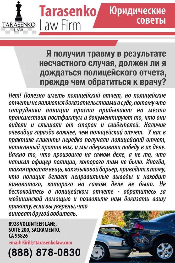 # 9 (2024) • 12 мая Газета «Диаспора» – все о нас с вами ПО ВОПРОСАМ РАЗМЕЩЕНИЯ РЕКЛАМЫ ОБРАЩАЙТЕСЬ ПО ТЕЛЕФОНУ: (916) 487-9701 или (916) 705-0739 8 РАЗВОД — занятие не из приятных, даже если оба супруга уже нашли новое счастье, не говоря уже о ситуациях, когда распавшаяся семья остро переживает конфликт и потерю друг друга. Но помимо психологической составляющей у развода есть еще одна –материальная. Люди приносят в брак свое имущество и наживают общую собственность, обзаводятся кредитами и долгами. Разводясь, все это приходится
