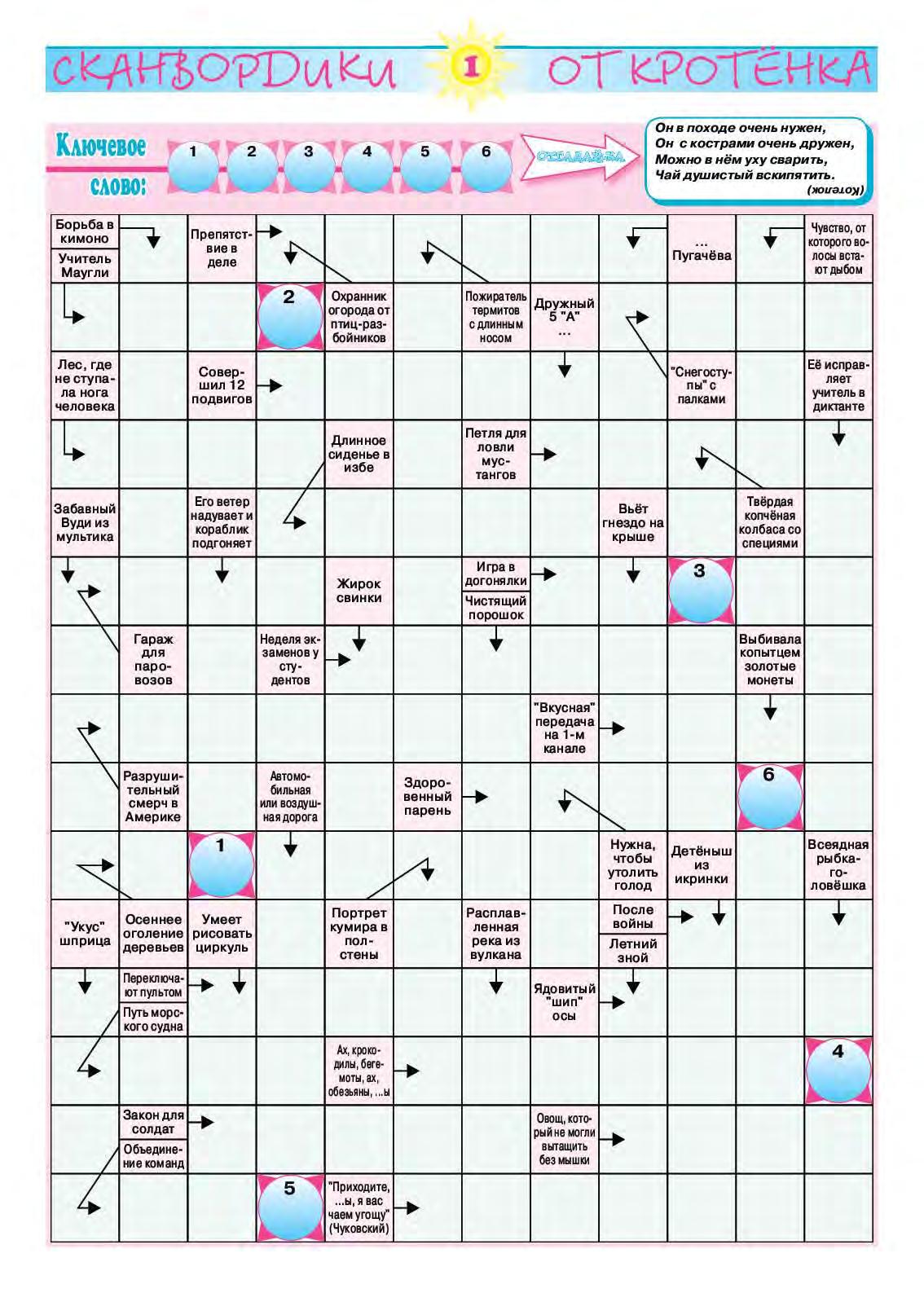 ОТВЕТЫ НА СУДОКУ 4. Грядка. 9. Ворота. 12. Спазм. 15. Бакенбарды. 16. Фигурист. 17. Агитатор. 18. Планшет. 19. Атрофия. 20. Резонанс. 22. Вход. 23. Сноровка. 24. Ятаган. 25. Натура. 26. Аншлаг. 29. Телеграмма. 30. Скачки. 32. Айкидо. 35. Хавбек. 37. Ясновидение. 38. Марганцовка. 39. Образование. 40. Тотализатор. 42. Карась. 44. Охапка. 46. Тамада. 48. Предбанник. 52. Взятка. 54. Свекла. 56. Артист. 59. Накладка. 61. Срок. 62. Кровосос. 64. Историк. 65. Общение. 66. Вездеход. 67. Зверинец. 68. Инструктор. 69. Атлет. 70. Апатия. 71. Амфора. 72. Аллея. ПО ВЕРТИКАЛИ: 1. Деформация. 2. Рогоз. 3. Саранча. 4. Гусыня. 5. Диалог. 6. Абонент. 7. Шествие. 8. Насадка. 9. Выбоина. 10. Радист. 11. Ангина. 12. Сатирик. 13. Актив. 14. Маргаритка. 21. Стык. 23. Сруб. 27. Лихорадка. 28. Газировка. 30. Скандинав. 31. Аннотация. 33. Изнанка. 34. Очередь. 35. Хамство. 36. Верстка. 39. Обстановка. 41. Релаксация. 43. Рева. 45. Писк. 47. Диалект. 48. Пародия. 49. Дискета. 50. Наколка. 51. Кафедра. 53. Заварка. 54. Склока. 55. Кастет. 57. Триумф. 58. Травма. 60. Козел. 63. Сингл.