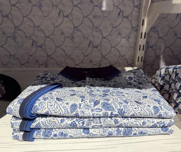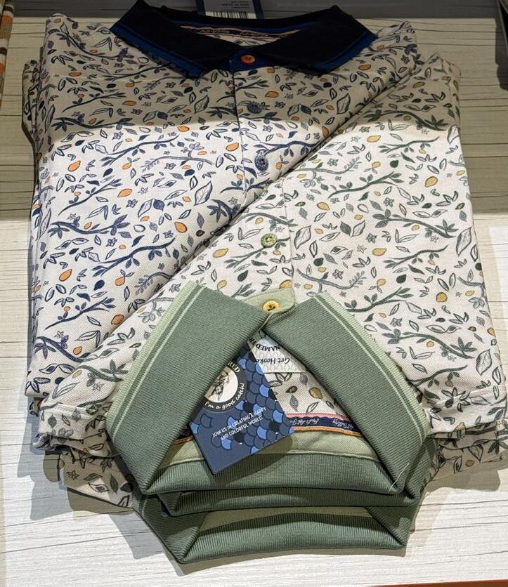 Die Polos sind so gefaltet, dass der linke Ärmel nach außen zeigt, sodass die Biese gut sichtbar ist und deutlich wird, dass es sich um ein kurzärmeliges Polo handelt.