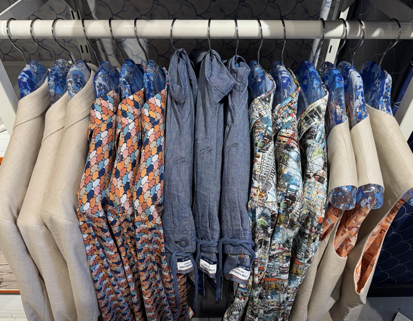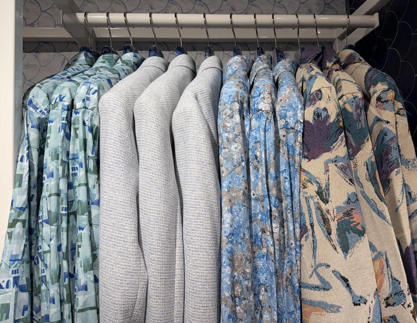 Die kurzärmeligen Hemden haben hochgekrempelte Ärmel und die Hosen sind spielerisch auf den Bügeln präsentiert.