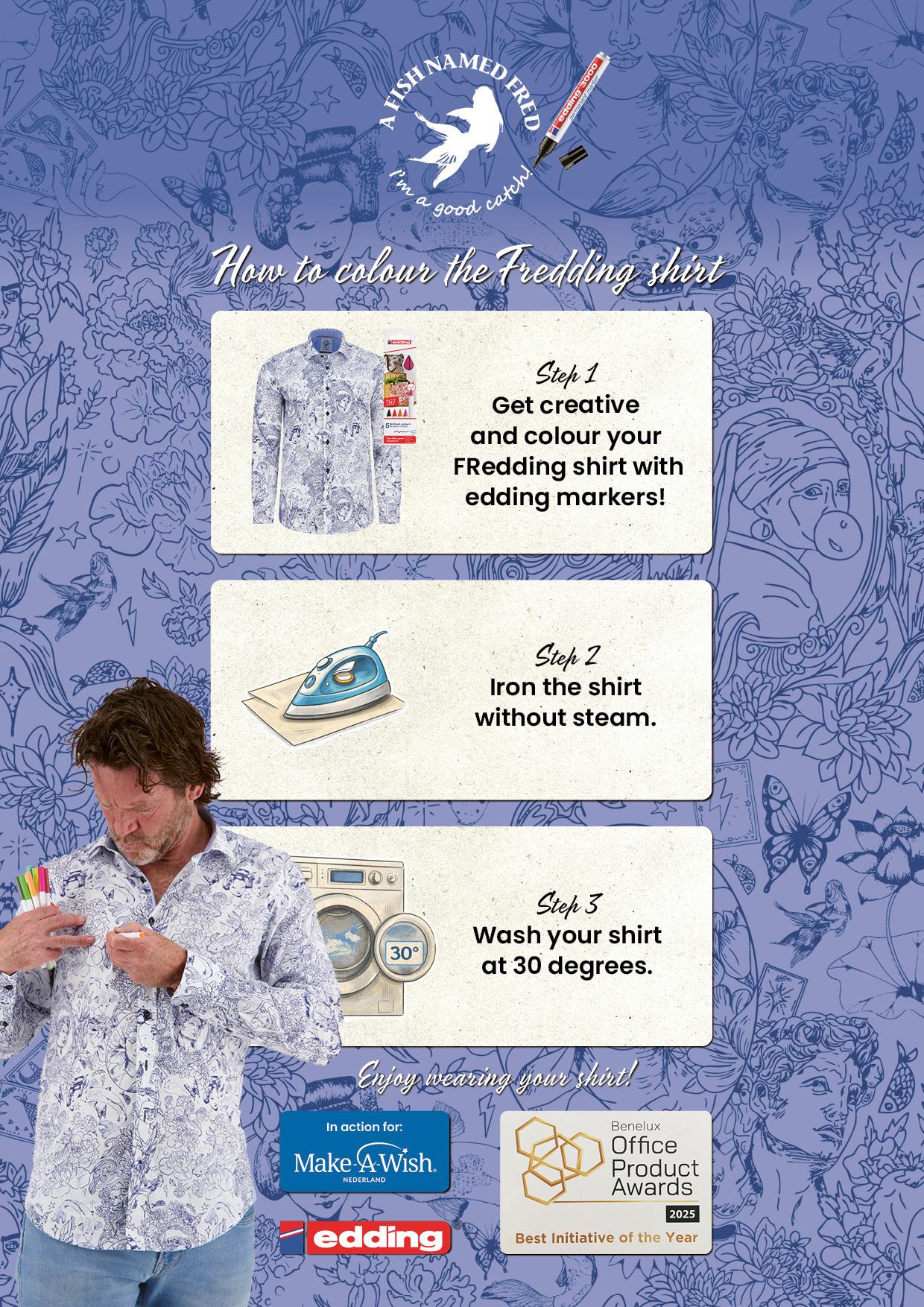 Dieses FRedding-Shirt ist das Ergebnis einer kreativen Zusammenarbeit zwischen edding und A fish named Fred. Durch einen inspirierenden Designwettbewerb hatten glückliche Gewinner die Möglichkeit, einen wirklich einzigartigen Print zu entwerfen.