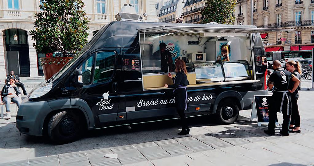 INSTALLÉ DEPUIS 2016 à côté de la Bibliothèque nationale de France et en itinérance à La Défense de mars à décembre, le foodtruck New Soul Food propose une cuisine afropéenne. Fin 2019, l’équipe menée par le chef Rudy Lainé a ensuite ouvert quai de Valmy le restaurant Le Maquis, avec ses plats de street food inédits, inspirés d’Afrique et des Caraïbes, disponibles en livraison et en click and collect. En 2020, Rudy Lainé a signé un partenariat avec l’enseigne Monoprix et vient d’installer un stand AfroTruck dans l’un de leurs magasins du 9e arrondissement. Au menu : des apéros à base de rhum arrangé aromatisé et de chips de plantain, et des plats, comme l’AfroKankan (côtelettes d’agneau aux épices) ou du poulet braisé aux herbes, au curry ou bien encore au poivre de Penja. Côté dessert, le tout nouveau Bamichoco (sans gluten) nous fait saliver : une mousse au chocolat noir de Côte d’Ivoire, avec cacahuètes grillées de Douala sur un lit de caramel et un biscuit chocolat-manioc. Quelques mètres plus loin, près du métro Colonel Fabien, on tombe sur l’iconique vitrine du Gumbo Yaya, véritable institution de la cuisine soul de la capitale. Ici, l’âme vibre