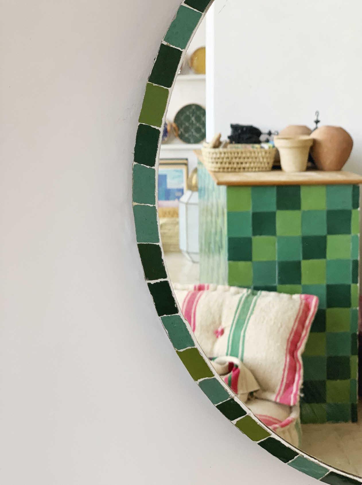 L’ART DU ZELLIGE, ces morceaux de terre cuite émaillés, découpés un à un et assemblés pour créer des motifs géométriques, a donné vie à des œuvres d’art millénaires. Avec l’Atelier Maloukti, l’architecte d’intérieur Nicolas Pascolini rend hommage à cette tradition marocaine revisitant des objets de tous les jours. Il fait arriver dans son atelier de Marrakech les carreaux bruts de Fès, ville renommée pour la qualité de sa terre argileuse, avant de procéder à la découpe en bâtonnets, losanges ou étoiles pour créer des tesselles qui recouvriront des tables, des plateaux en bois ou fabriqués à partir d’anciens tamis à couscous, ou encore des miroirs. Chaque pièce apporte une touche créative dans un appartement contemporain mais a aussi sa place dans une maison traditionnelle marocaine, comme les magnifiques riads et villas que l’Atelier a redessinés depuis son ouverture, en 2020. Pour souligner l’esprit moderne de ses créations, Nicolas Pascolini a travaillé avec les couleurs, introduisant des nouvelles teintes et des nuances pastel, comme le rose et le vert, mais aussi avec les lignes. Les structures des tables, en métal, ont été conçues pour obtenir des profils plus fins, qui valorisent les motifs en céramique. ■ L.N. ateliermaloukti.com