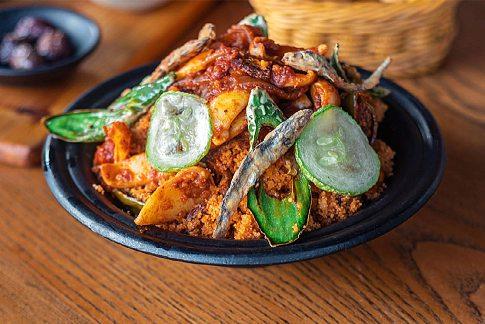 Pour un incroyable couscous de poulpe, mijoté dans une sauce aux épices douces et accompagné de semoule roulée à la main et séchée au soleil, il faut regarder du côté de La Goulette, un quartier emblématique qui accueille The House – El Houche. Un terme qui désigne la maison traditionnelle de Djerba, bâtie autour d’un patio central, un lieu de vie intime et convivial. Tout comme cette table profondément djerbienne, où l’on trouve des recettes authentiques, réalisées d’après les traditions. Comme le masfouf, un couscous à base de kadid, de la viande séchée sur les toits et épicée, et de wzef, des poissons et seiches eux aussi séchés au soleil. Mais aussi le riz djerbien et le thrid, recettes précieuses parfois revisitées à la sauce goulettoise. @lesindecis.tn/@the_house_el_houche ■ L.N.