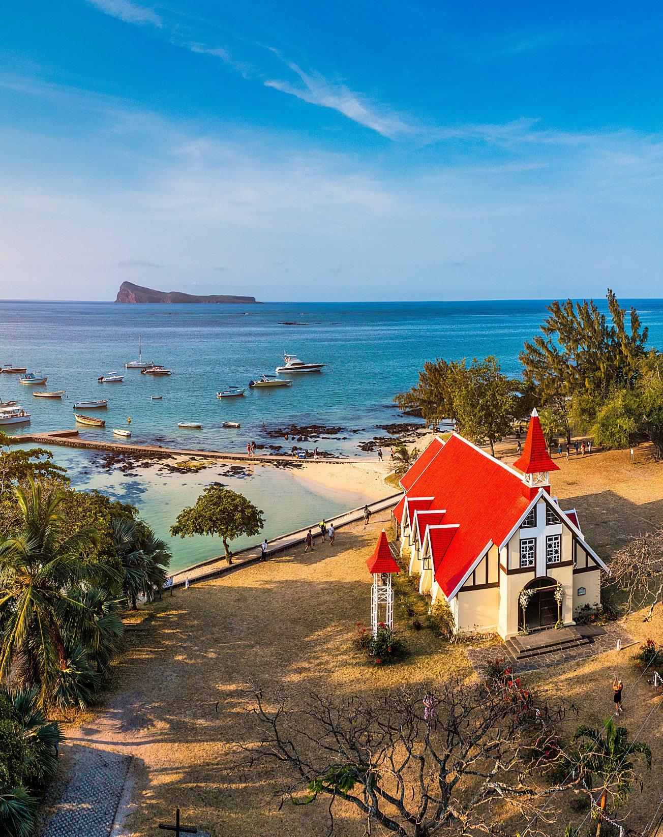 Le village de Cap Malheureux et sa célèbre église au toit rouge.