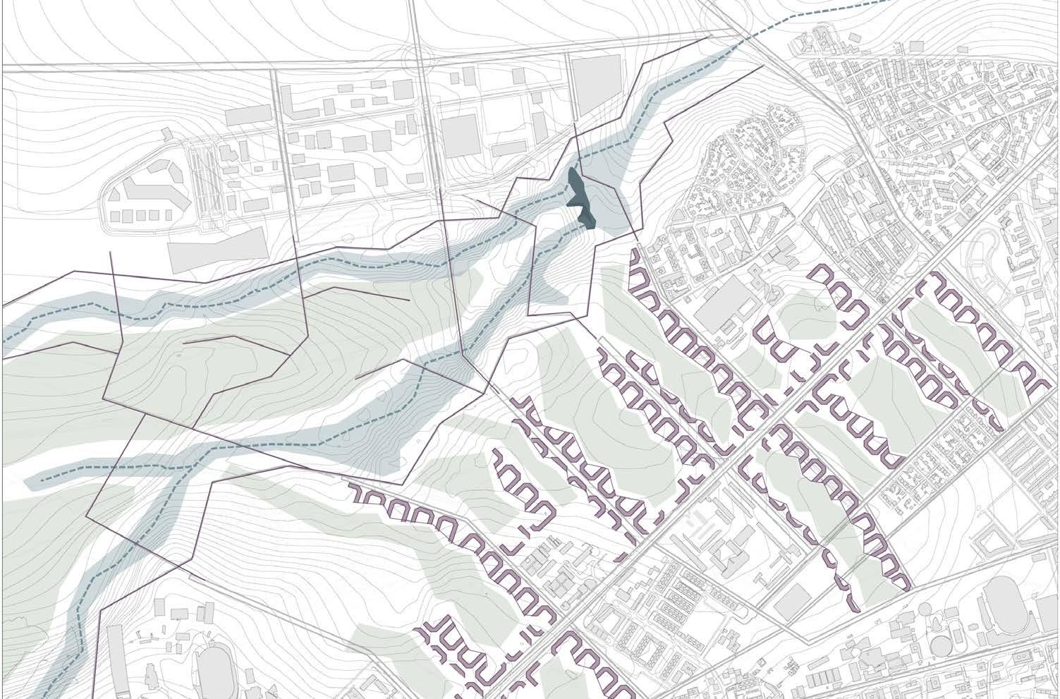 Proposal of a density gradient for the housing units, being denser towards the main avenues and more difuse towards the natural reserve areas