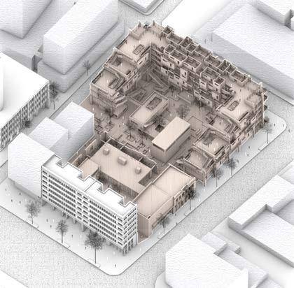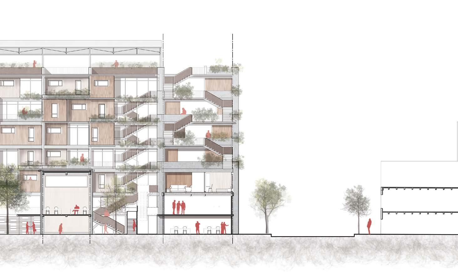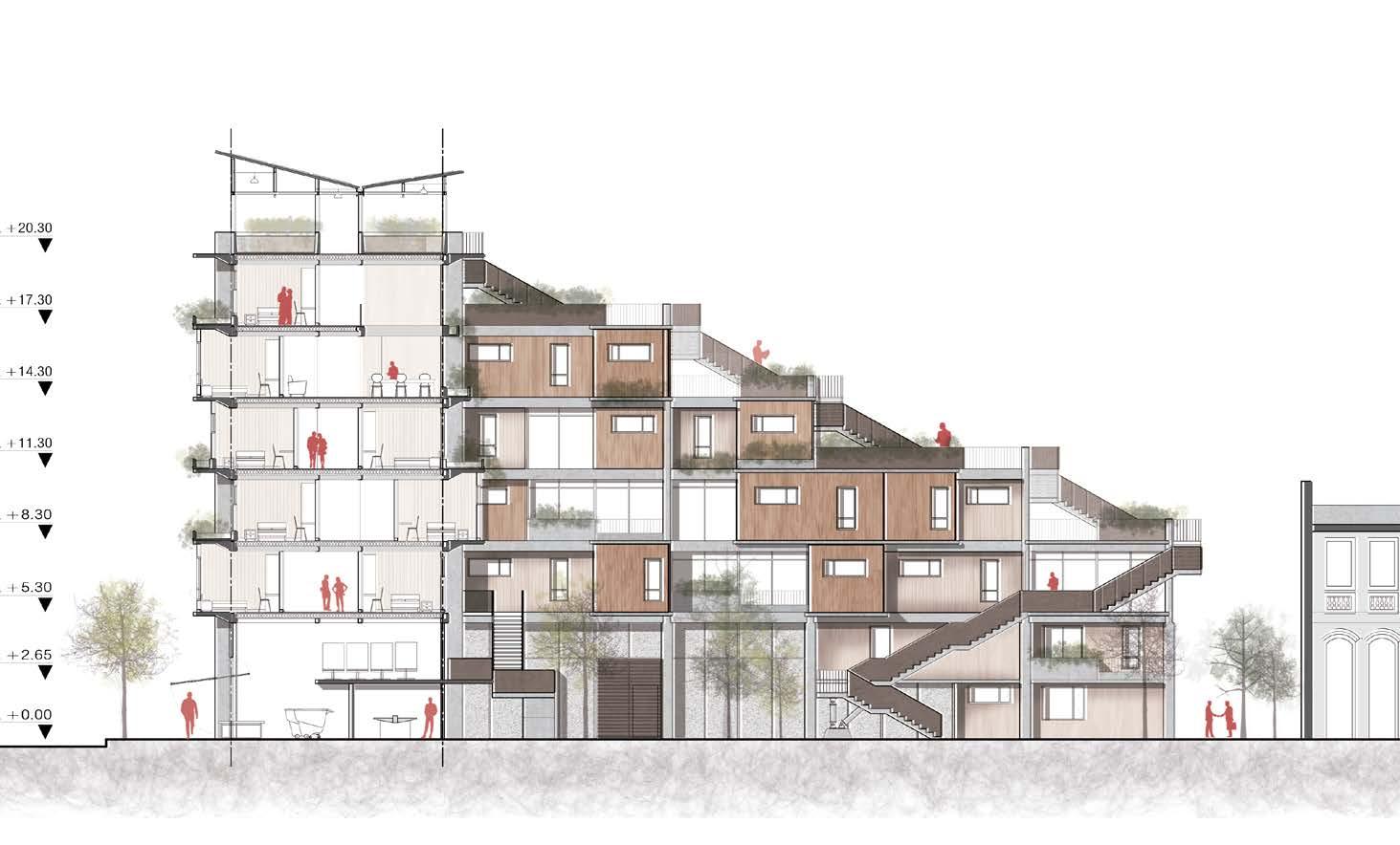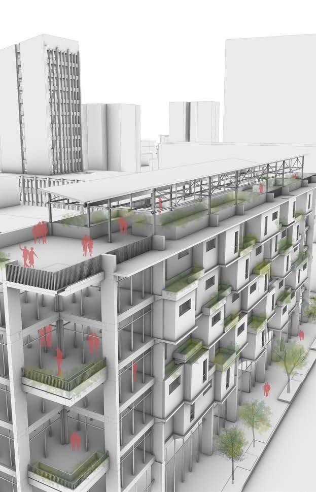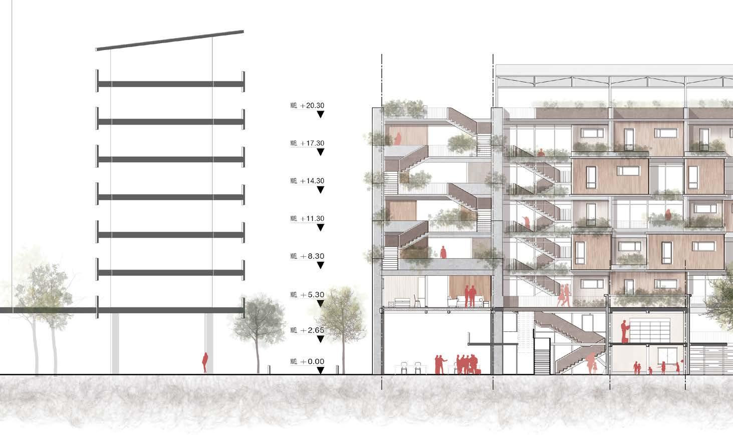 For the formal proposal, a 9-level building for collective housing with staggered terraces that are connected through a set of exterior and interior stairs create a circuit of well being communal spaces for the community. In these proposal, the corners play an important role for each floor, as it works as a node for shared service spaces such as kitchens, bathrooms and dining rooms, plus communal terraces that are oriented towards the inside of the block, serving