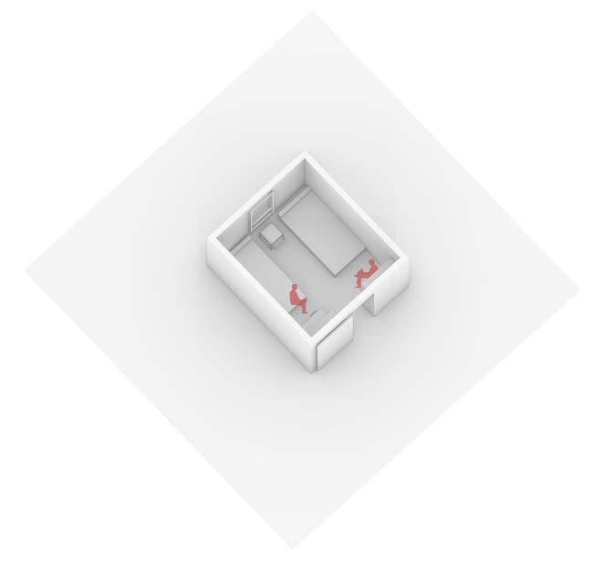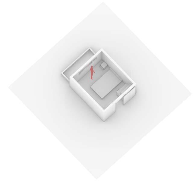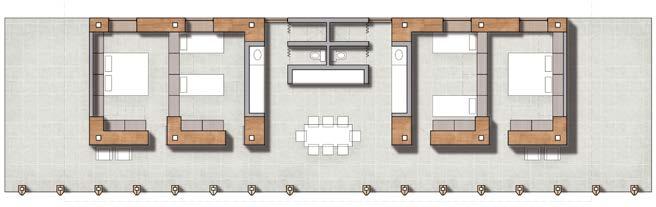 Based on this module, private bedrooms are proposed, with single modules (for single workers or couples with no children, or double modules (for singles or couples with kids or the need of an extra working space) Also, bathrooms are proposed from 1 1/ 2 modules, while other communal spaces consist of 2 complete modules with a material distinction that states the communal division between these spaces. The overlap between modules aims to generate diverse communal spaces in the inside circulations, creating different size reunion spaces in which the community can create different type of positive interactions.
