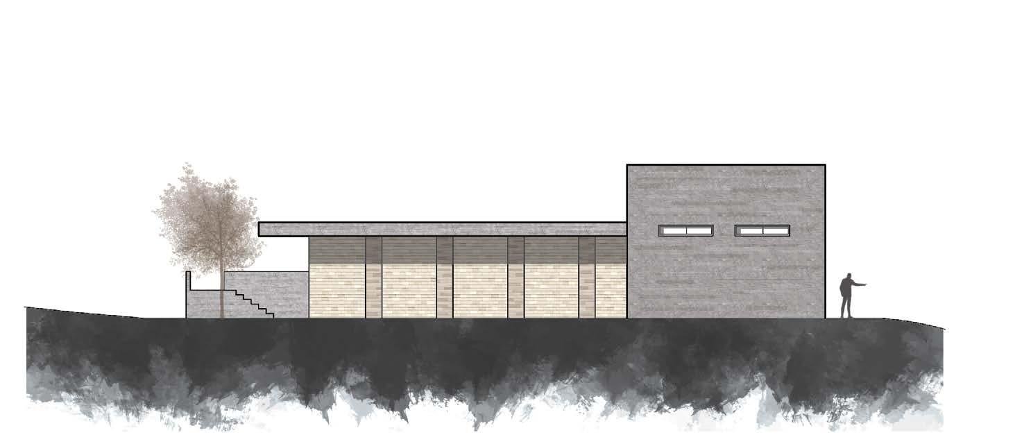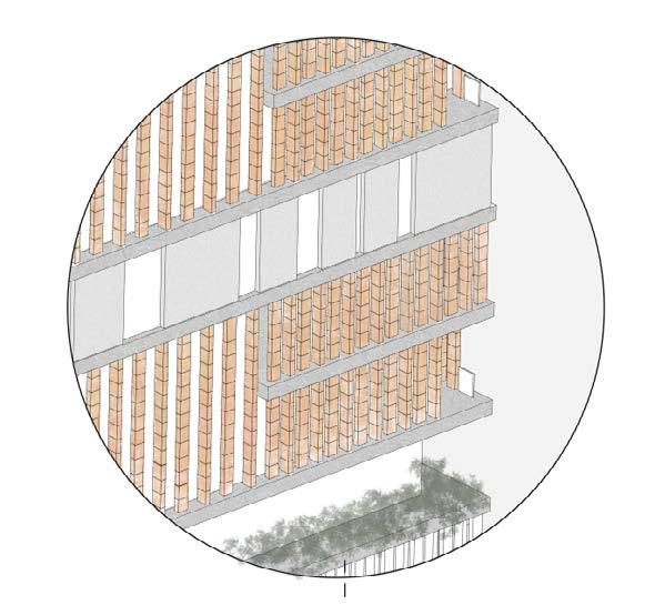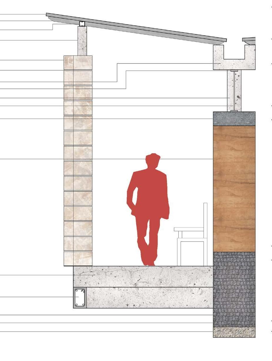 enviromental impact, while creating a very energetic-efficient house by keeping the houses fresh during hot days. For the circulation and service spaces, BTCR (compressed earth blocks) were proposed, as it can be a lighter material that allows external visuals for the porch of the house. The architectural roof is made with lighter metalic plates with a cellulose layer, aiming for a low cost local material that could also isolate the house from external temperatures. The slope of the the roof aims to pick up all the water from the roof into one channel beam that allows for the water to be collected to be used for gray waters and crops, as water can be hard to access in certain months.