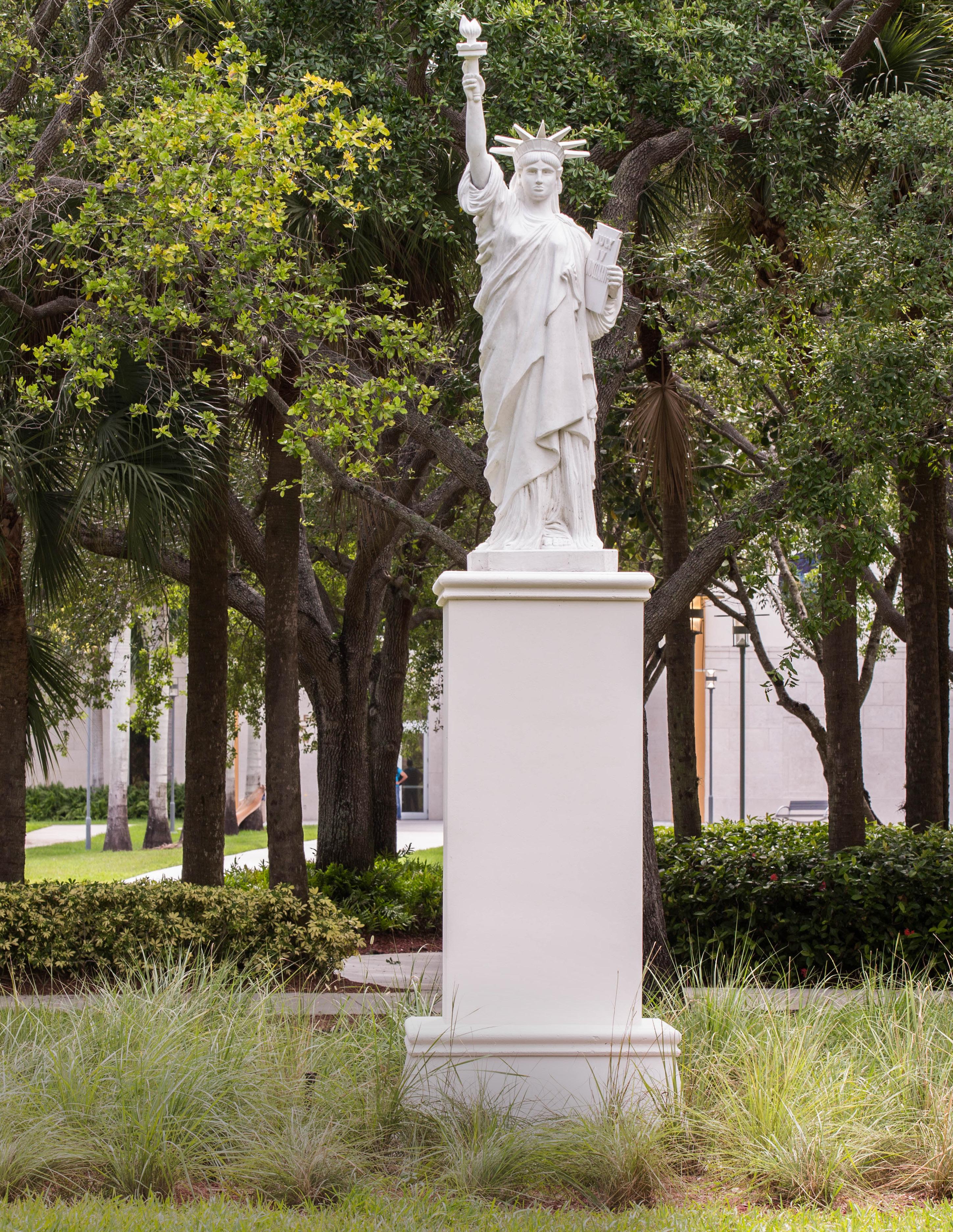 Replica of the Statue of Liberty on the lawn beyond the FIU College of Law