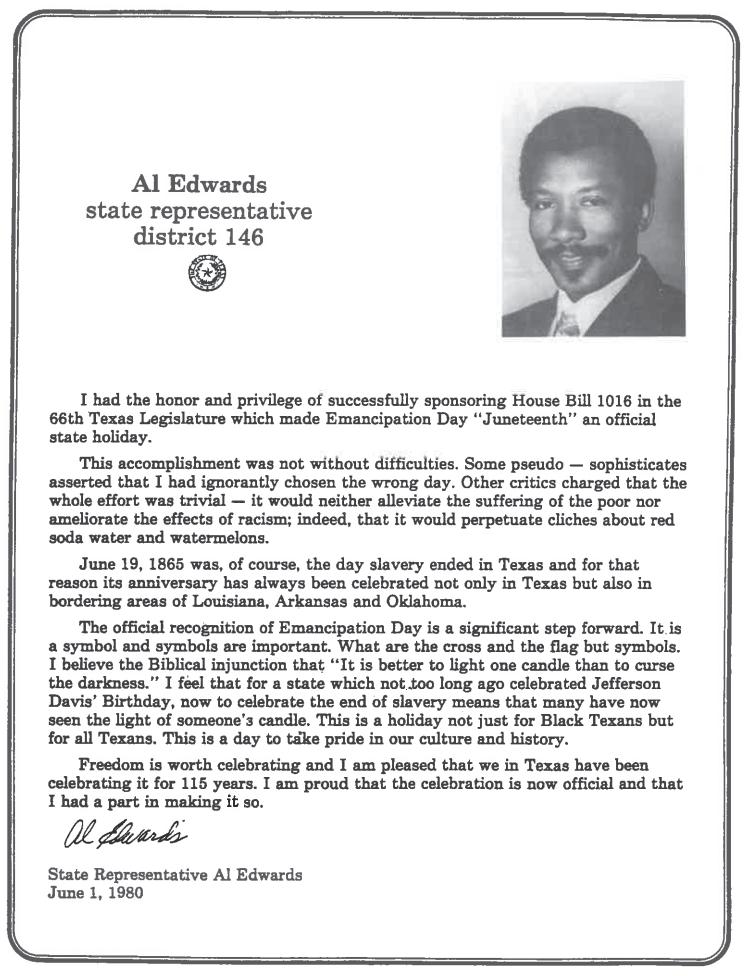At the age of forty-one, Edwards entered politics and was elected to the Texas State Legislature from Houston’s House District 146. His rst major goal was to ensure the establishment of a holiday that recognized the emancipation of slavery. In 1979, legislation recognizing Juneteenth Day, initiated by Edwards, passed the Texas State Legislature and was signed into law. Juneteenth, also known as Freedom Day or Emancipation Day, is an annual holiday in fourteen states of the United States. Celebrated on June 19th, it commemorates the announcement of the abolition of slavery in