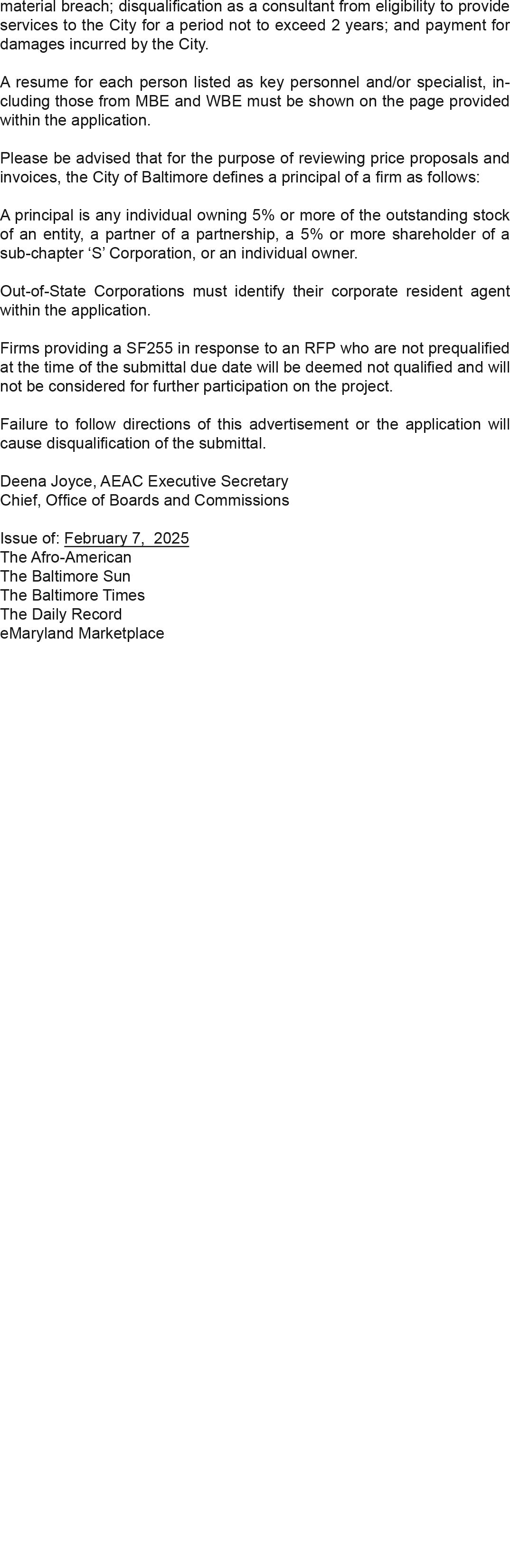 Sealed Bids or Proposal for the TR-25007, RESURFACING HIGHWAYS AT VARIOUS LOCATIONS, NORTHEAST, SECTOR – I will be received at the Office of the Comptroller, Room 204, City Hall, Baltimore, Maryland until MARCH 5, 2025, at 11:00 A.M. to receive Bids. Positively no bids will be received after 11:00 A.M. The bids will be publicly opened by the Board of Estimates in Room 215, City Hall at Noon. As of FEBRUARY 7, 2025 the Contract Documents may be examined, without charge by contacting Brenda Simmons at brenda.simmons@baltimorecity.gov or (443) 8654423 to arrange for a copy of the bid book labeled “NOT FOR BIDDING PURPOSES” to be emailed to you. Anyone who desires to purchase a bid book to be used for bidding purposes must do so in person and by contacting Brenda Simmons at the email address or phone number above. The non-refundable cost is SEVENTY -FIVE DOLLARS AND NO CENTS ($75.00) Department of Transportation 417 E. Fayette Street, Baltimore, Maryland 21202 made payable to the Director of Finance. Conditions and requirements of the Bid are found in the bid package. All contractors bidding on this Contract must first be prequalified by the City of Baltimore Contractors’ Qualification Committee. Interested parties should call (410) 396-6883 or contact the Committee at 4 S. Frederick Street, 4 th Floor, Baltimore, Maryland 21202. If a bid is submitted by a joint venture (“JV”), then in that event, the document that established the JV shall be submitted with the bid for verification purposes. The Prequalification Categories required for bidding on this project are A02602 (Bituminous Paving) and D02620(Curbs, Gutters & Sidewalk). Cost Qualification Range for this project will be from $3,000,000.00 to $4,000,000.00. A “Pre-Bidding Information” session will be conducted via Microsoft Teams on FEBRUARY 21, 2025 at 10:00 a.m. hosted by the Department of Transportation. All Bidders must email your contact information to include your name, company name, phone number and email address to uttam.khadka@baltimorecity.gov to receive an invite to the Microsoft Team (video conference meeting). Principle Items of work for this project are: Superpave Asphalt 12.5MM and 19.0MM and Various Mix 11,200 Tons; Curbs, Curbs & Gutters 4,690 LF; Sidewalk 42,500 SF. The MBE Goal is 21%; The WBE Goal is 9% APPROVED: Celeste Amato, Board of Estimates