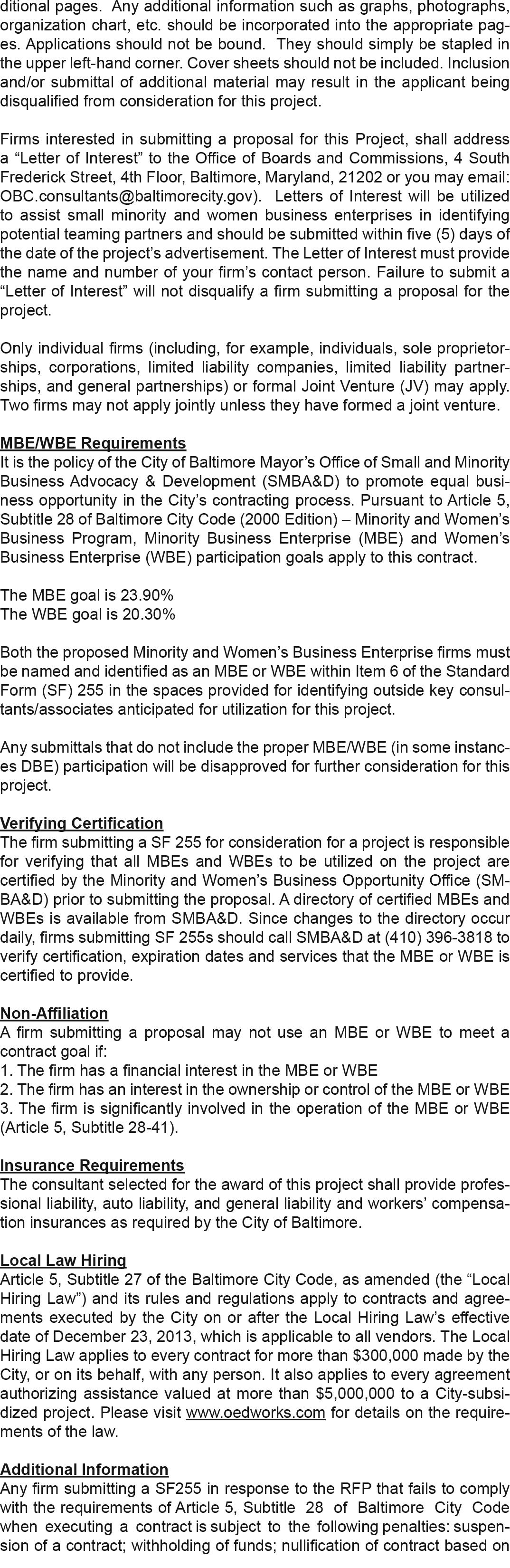 BCRP encourages consulting firms having the specified experience who have not previously worked with the City of Baltimore, and those who are currently working with the City that have the capacity to deliver the specified work in this scope, to submit their proposals. During presentation, consultants must demonstrate and document their capacity and resources to deliver the required services on time.