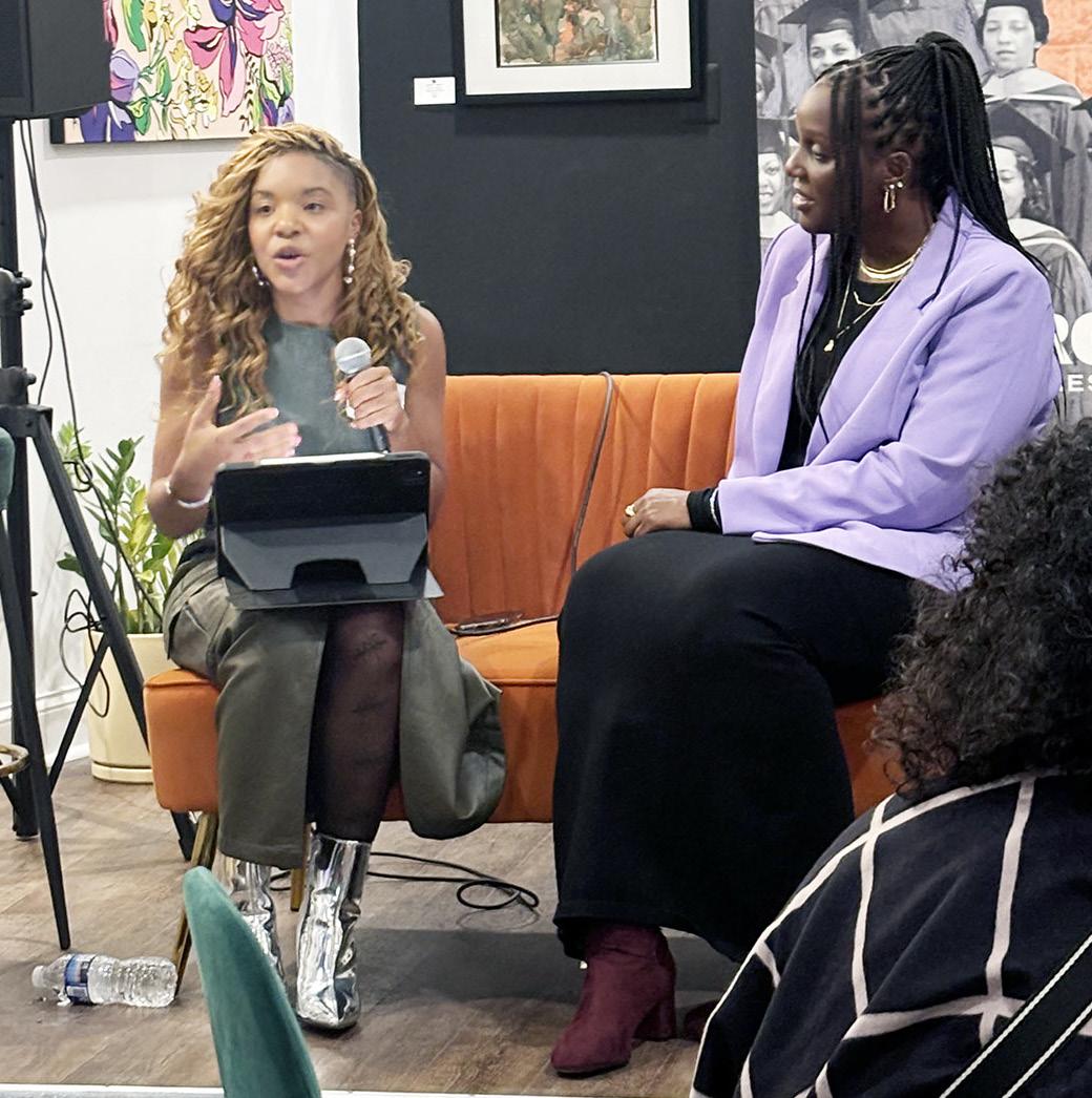 Deyane Moses (left), director of programs for Afro Charities, and Nichole Hill, an award-winning podcast creator, discuss the AFRO’s “Lonesome Hearts” column during an installment of the Afro Charities’ series, “Re-Reading the News.”