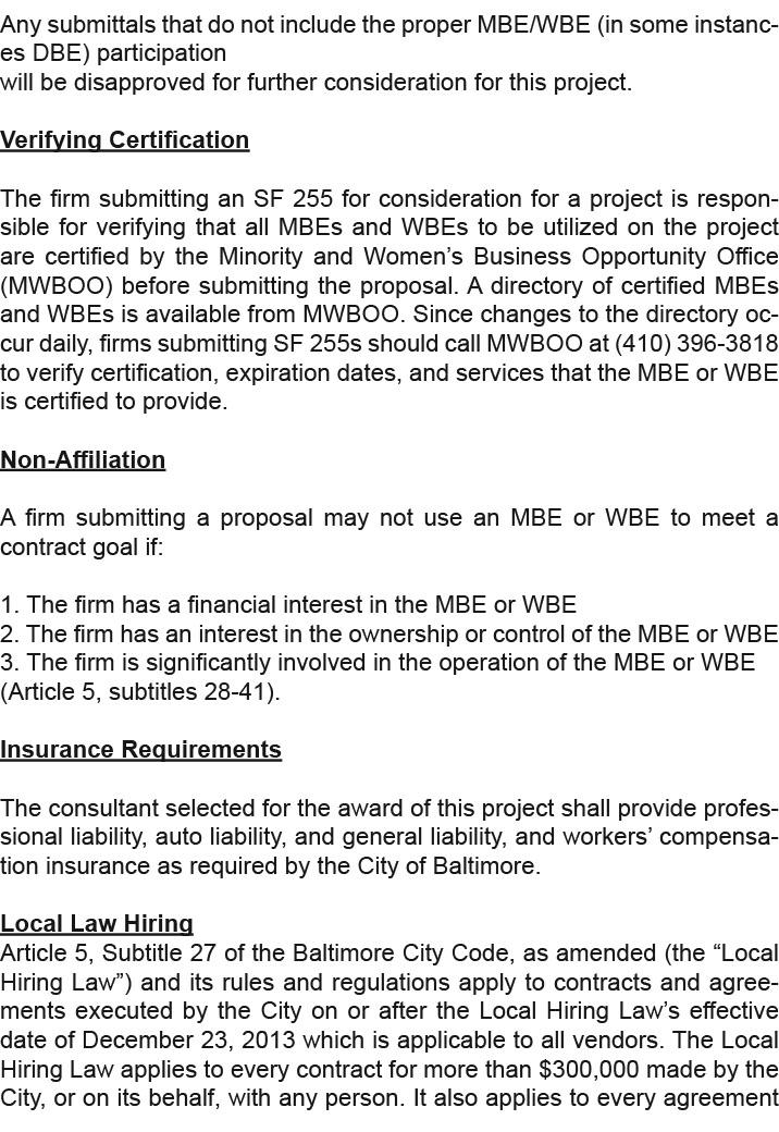 All firms listed in the specific proposal for the Project must be prequalified by the Office of Boards and Commissions for each applicable discipline at time of submittal for this Project. A copy of the prime and sub consultant’s current Prequalification Certificate should be included in the bid submittal package. Information regarding the prequalification process can be obtained by calling the Office of Boards and Commissions on 410-396-6883.