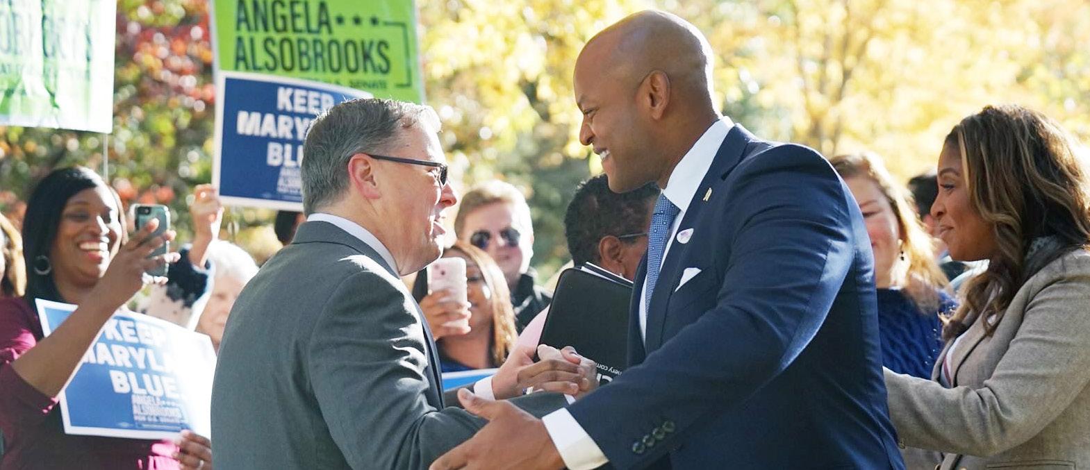 Gaithersburg Mayor Jud Ashman (left) shakes hands with Maryland Governor Wes Moore (right) and at an event in support of Prince George’s County Executive Angela Alsobrooks as she competes against Larry Hogan, former governor of Maryland, for the state's U.S. Senate seat. Although Ashman once backed Hogan, he has decided to cast his ballot for Alsobrooks in the 2024 election.