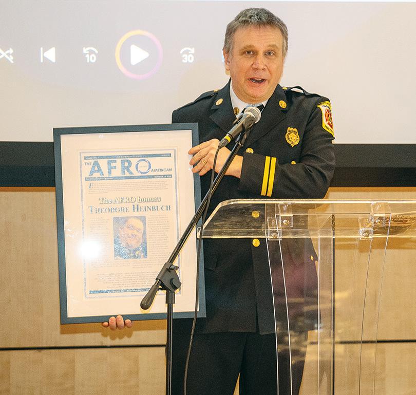 Paul Novack, of the Baltimore City Fire Department, accepts the AFRO Unsung Heroes award on behalf of Theodore Heinbuch.