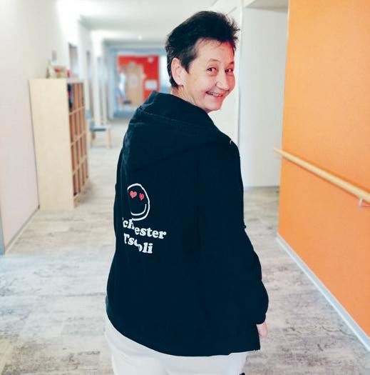 Tscholi‘. Eines Tages hatte ich die Idee, ihre Worte auf einer Jacke zu verewigen. Als Hedy mich beim ersten Mal darin sah, musste sie so laut lachen, dass ihr die Tränen kamen. Hedy ist nicht mehr unter uns, doch jedes Mal, wenn ich diese Jacke trage, werde ich von Hedys Herzlichkeit beseelt. Gelegentlich trage ich die Jacke auch auf dem Wohnbereich, dann höre ich wie hinter mir leise gekichert und gesagt wird ‚lueg do, d‘Schwöschter Tscholi isch do‘. Wenn ich mich dann umdrehe und sage ‚Jo, de Tscholi vom Dienscht isch do‘, geht das Gelächter los – und für ein paar Minuten werden Sorgen, Schmerzen und Kummer vergessen. Es freut mich, was so ein Name alles bewirken kann.