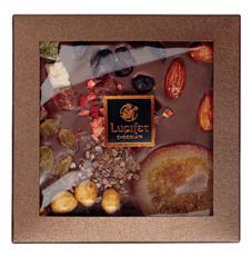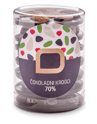 Čokoladni krogci – posuta čokolada Čokolada temna 70% kakavovih delcev, s posutim sadjem in oreščki, 90 g. V ceno je že vključen dekorativni trak in obešanka s sporočilom. 5,10 EUR