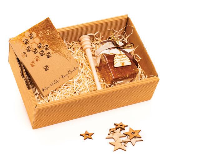 Čebelice iz medene čokolade 80 g v lični embalaži z motivom panjskih končnic. V ceno je že vključen dekorativni trak in obešanka s sporočilom.