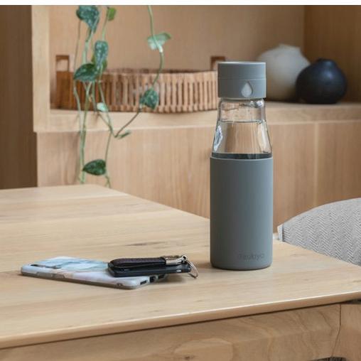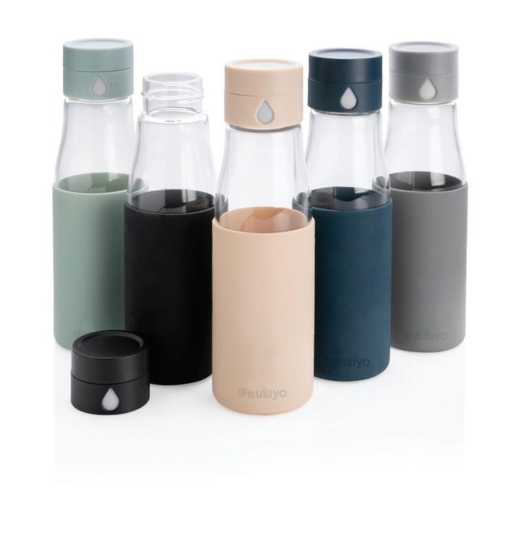 Ukiyo steklenica za sledenje hidraciji s tulcem Pametno oblikovana 600 ml steklenica za vodo iz borosilikatnega stekla Ukiyo. Pokrov prikaže večjo kapljico vode vsakič, ko napolnite in zasukate pokrov, tako da lahko preprosto štejete število steklenic,