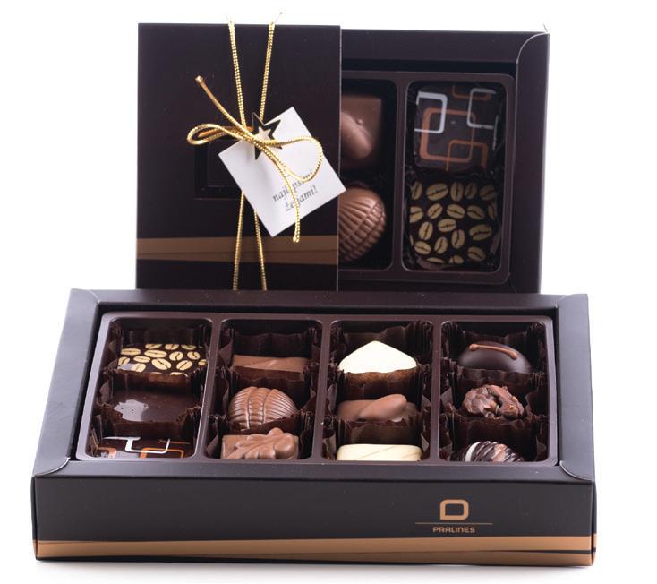 edinstvene čokoladne užitke vsebuje 25 ročno izdelanih, svežih, raznovrstnih čokoladnih pralin, 360 g.