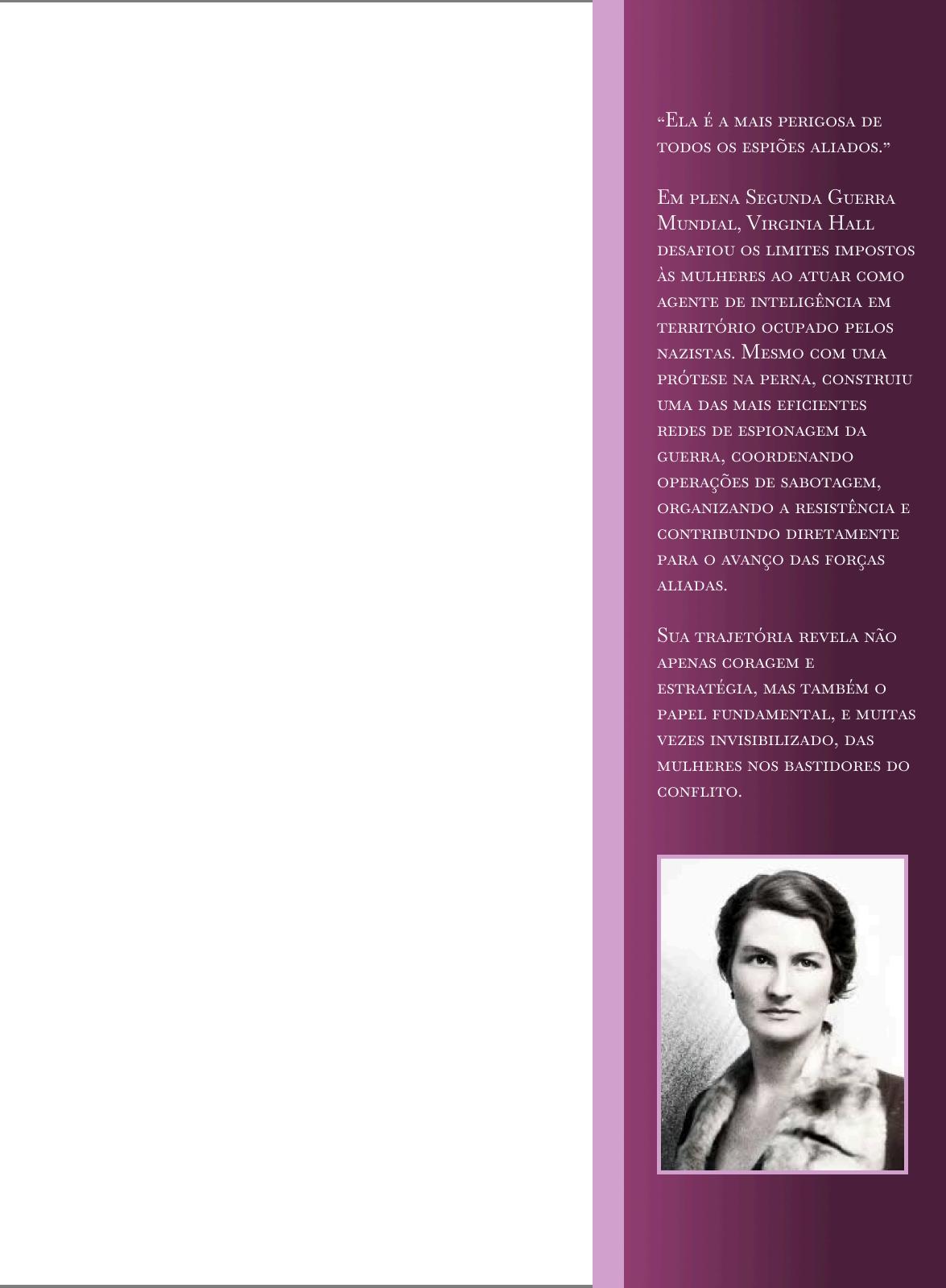 Em 1942, a Gestapo, polícia secreta nazista, enviou uma mensagem urgente: “Ela é a mais perigosa de todos os espiões aliados. Devemos encontrá-la e destruí-la.” O alvo era Virginia Hall, uma socialite americana que se transformou em espiã do Ministério da Guerra britânico e, posteriormente, dos Estados Unidos. Chamada pelos alemães de “a dama que manca”, Virginia, que possuía uma prótese de madeira na perna esquerda, nunca foi capturada por eles. Para enganálos, usava maquiagem, peruca e outros subterfúgios tipicamente femininos.
