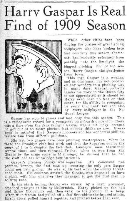 SABR said his true introduction to fans came on April 17, 1909: “Early in 1909 Reds fans saw real promise in the 6-foot, self-assured slinger from the state where the tall corn grows. In the second inning of an April 17 home game with Pittsburgh, he came in to relieve veteran lefty Ed Karger, who had allowed five runs. Shutting down the opposition, Gaspar worked through the ninth while his teammates helped him register his first big-league win, an 8-5 victory. Sportswriters still regarded him as unpolished, but remarked on his strength and natural ability. By early August, when The Sporting News decried the Cincinnati club’s lack of pitching, it named Gaspar as one of only three in fine form.”
