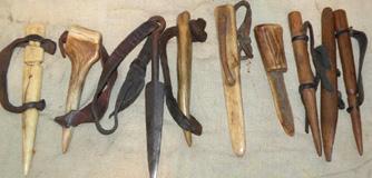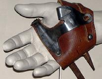 Contestants used a steel peg or hook strapped to their hand to tear the shucks open on the corn. Many huskers wore gloves but some shucked barehanded. The method mostly used in husking was to grip an ear with the left hand, yank off the husk with the right hand, twist the ear from the stalk with the right hand and throw the ear into the wagon with the right hand.