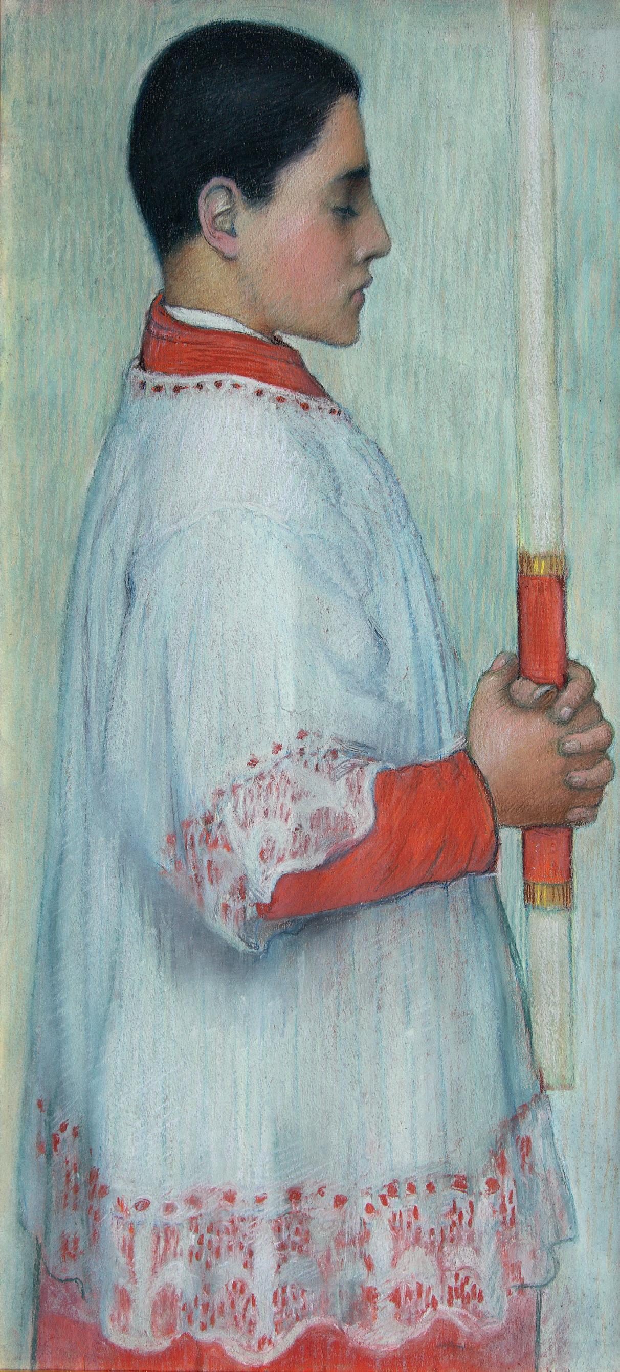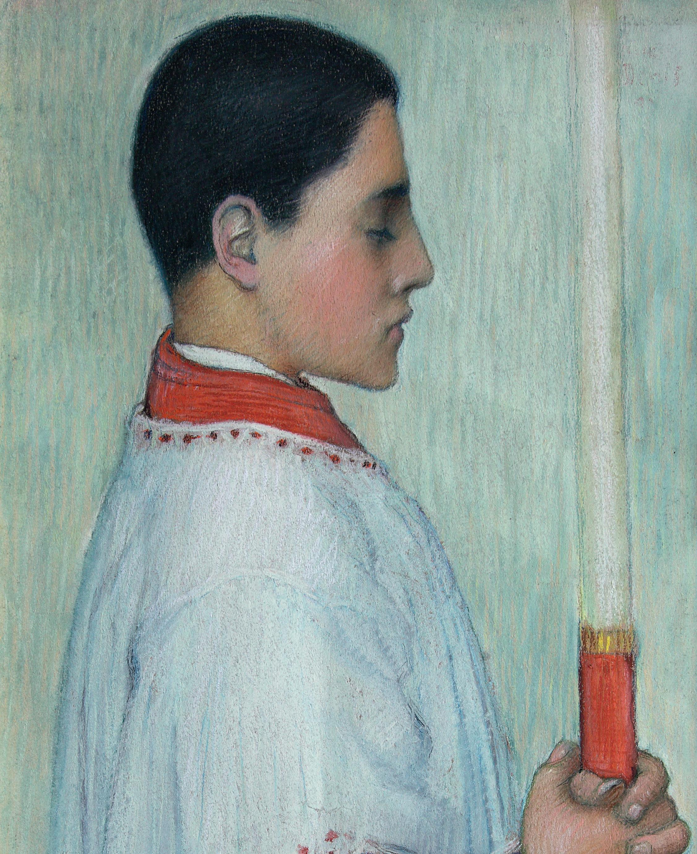 The theme of the altar boy recurs frequently in Denis’ work. The exceptional pastel L’Enfant de chœur marks a turning point in his artistic life, as it is the very first work he exhibited at the Palais des Champs Elysées, during the 108th Salon de la Société des artistes français in May 1890. This meticulous drawing shows a perfect mastery of pastel, which Denis uses to render a play of delicate shadows and the delicacy of white lace over the boy’s bright red alb. The child’s face, with closed eyes and a hieratic posture, contributes to the solemn character of the picture. This pastel is a preparatory sketch for the work Mystère Catholique, begun in 1889, for which Denis produced five versions until 1891. In that larger composition, the artist depicts an Annunciation but replaces the Archangel Gabriel with a deacon and two altar boys. The poet Adolphe Retté