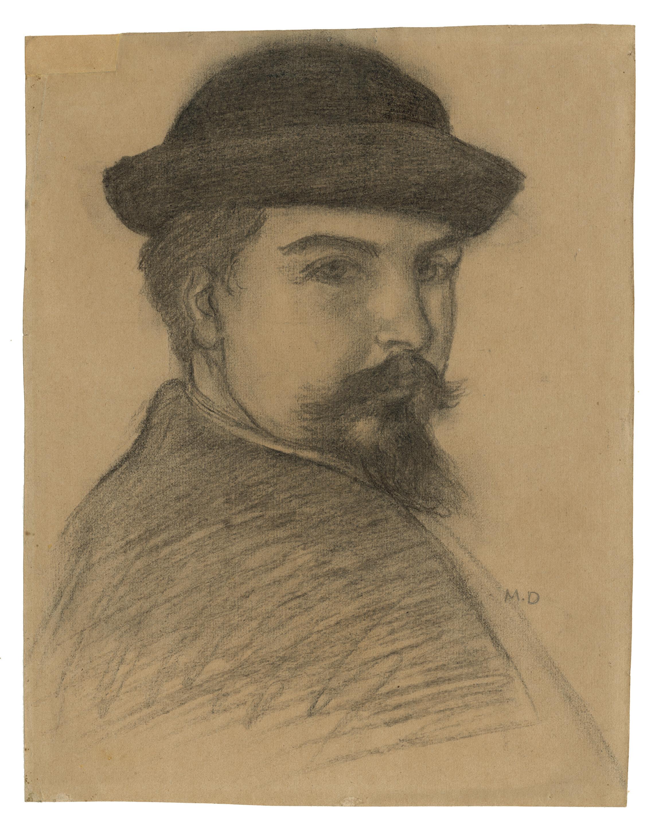 Like all great artists, Maurice Denis practised the art of self-portraiture. He made about fifteen self-portraits during his career, each of which bears witness to his state of mind, his artistic interests, and his physical appearance at a key period in his life. In October 1889 he wrote in his diary: “And in the mirrors, as I passed by, my face appeared less vulgar, as if radiating a higher spirituality.”1 This sense of confident self-regard is reflected in Autoportrait au chapeau noir, in which the artist looks directly towards the viewer under a straight round hat, his facial features precisely detailed. This drawing is a study for the fifth panel of the decorative ensemble La Légende de Saint-Hubert, commissioned in 1895 by Baron Cochin to decorate his office, and completed in 1897. The artist inserts his own likeness into the final composition. Denis again sought to integrate his personal and family life into a narrative of Christian iconography for the work Sinite Parvulos venire ad me of 1900 (Clemens Sels Museum, Neuss), for which the second Autoportrait is a study, this time