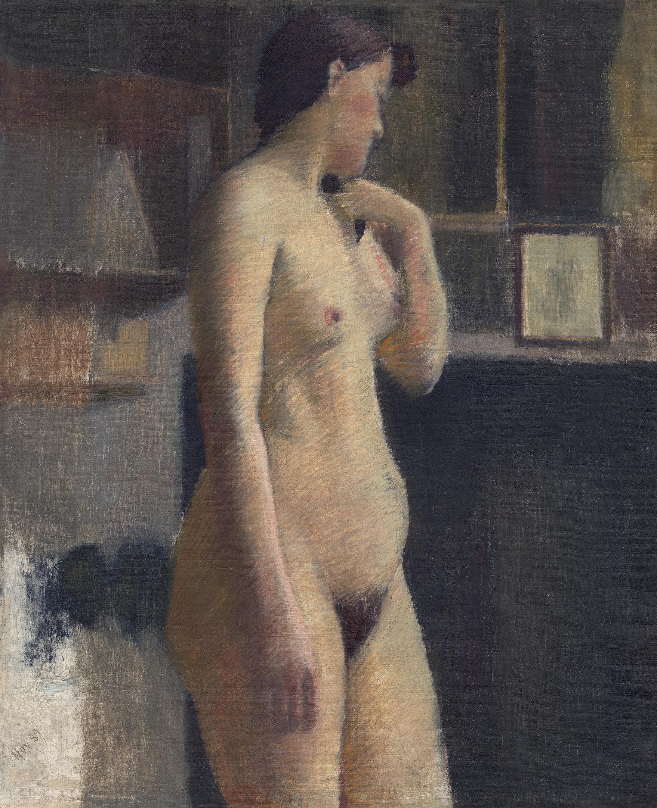 In his first diary, Maurice Denis thus explains his personal vision for depicting the human body. In the present painting, the artist takes part in the long tradition of the academic nude, but his technique reveals the evolution of his artistic research. The space is materialised by geometric shapes that structure the composition, and this background is treated in flat tones of grey, contrasting the woman’s body and giving it a sculptural presence. The intense black of her hair and sex responds to the black square evoking a piece of furniture in front of which she poses. The body is not smooth, but vibrates with light. This quality Denis has achieved by using visible hatching brushstrokes which almost obscure her form, as if the artist was trying to preserve the mystery of (and his respect for) the woman’s body, thus mixing sensuality and spirituality. The painting’s frontal and explicit nudity recalls to that of La Dame au Jardin clos (Musée d’Orsay, Paris) made later, in 1894, which represents the artist’s wife, Marthe. In these two works Denis succeeded in translating all the carnal beauty of the female body, which is also found in nudes seen from the back, as for instance Nu, femme assise de dos of 1891 (Musée d’Orsay, Paris), and Nu au crepuscule (Private collection), ca. 1892.