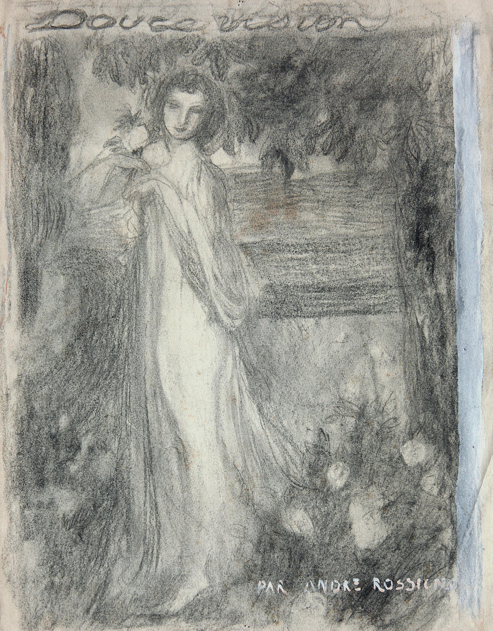 In parallel with these projects decorating domestic objects and architectural features, Maurice Denis also worked to illustrate literary publications. In 1894 he produced a series of lithographs for the covers of the booklet Apparition / poèmes de Stéphane Mallarmé / musique de André Rossignol. These illustrated musical plates, of which the present drawing, Douce vision, is a preparatory sketch, evoke a delicate melancholy and subtle grace. The women in these plates, with their languid silhouettes and their ample, flowing dresses, suggest a kind of fairy-tale feminine ideal, recalling the symbolic character of Denis’ work. This woman surrounded by rosebushes, perfectly sketched in pencil, could be a variant the woman found in Denis’