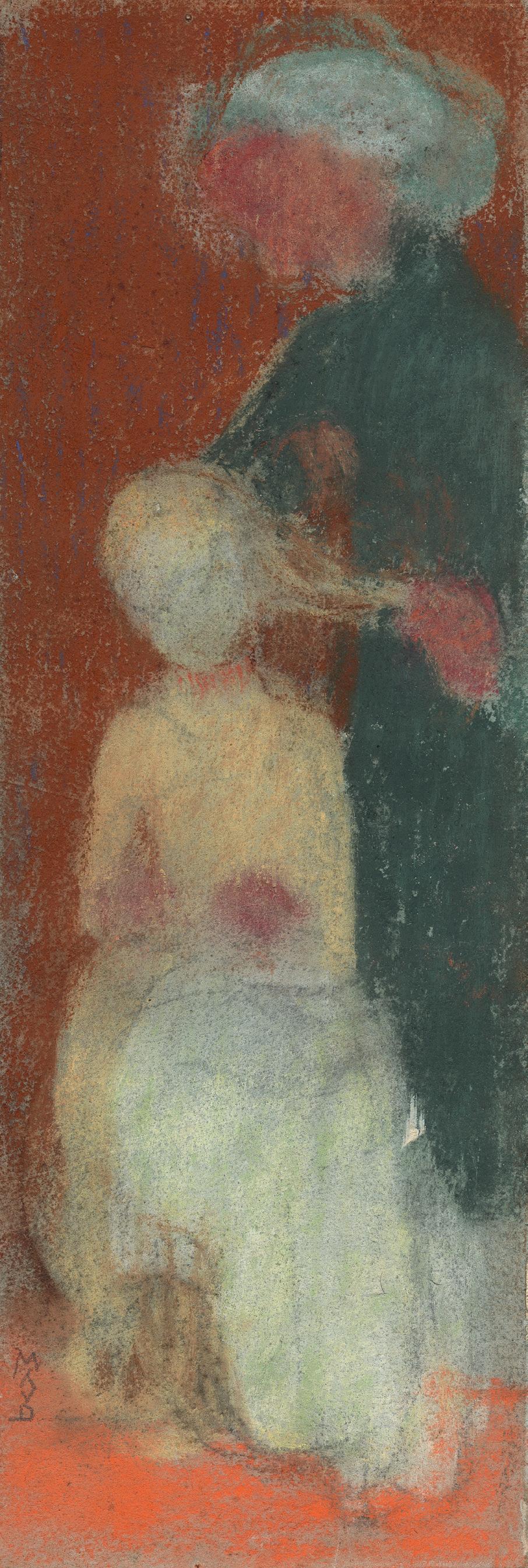 That a single artwork might move freely between sacred and profane subjects, between the love of God and that of women and children, is confirmed by the pastel Femme coiffant un enfant. In this composition, the artist models each form and defines the contours of its silhouettes entirely through colour. The apparent speed of its execution sits in counterpoint to the obvious